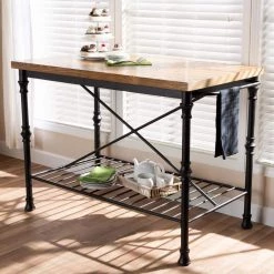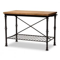 Make efficient use of your kitchen space with the Perin kitchen island table. Constructed from sturdy dark bronze-finished metal, the Perin features a MDF wood tabletop in a distressed ash veneer finish for elegant contrast. This handy table is equipped with a spacious tabletop that can be used to eat meals on, serve dinner guests, or store kitchen items. The Perin is also fitted with two towel holders and a bottom rack that provides storage space for pots, pans, and more. Inspired by industrial design, the table features with a crisscross stretcher for both structural support and visual interest. Striking attention to detail is displayed in the stunning moldings that adorn the frame. Use this versatile table as a kitchen island or add a few bar stools for use as a dining table. The Perin kitchen island table is made in China and requires assembly.