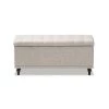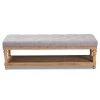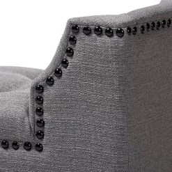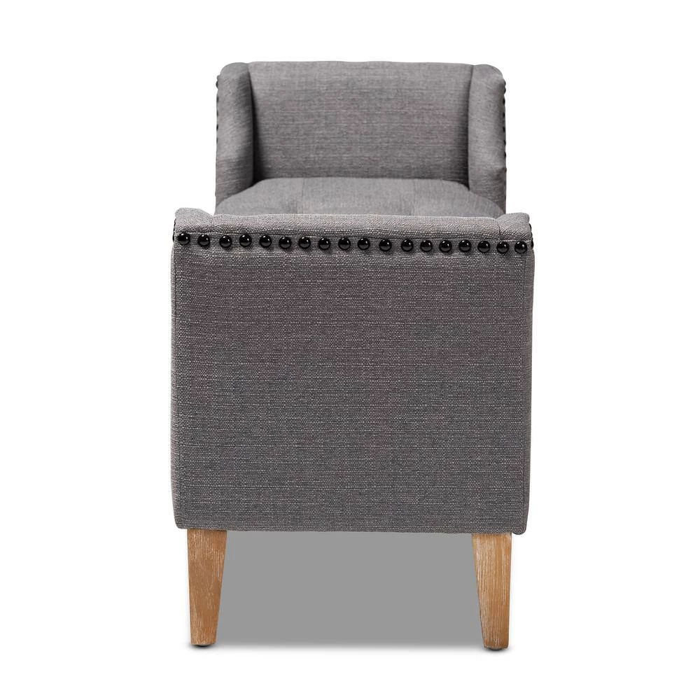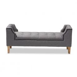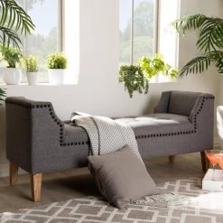 With its regal silhouette and comfortable seating, the Perret bench is an exquisite addition to any space. This solid birch wood bench is upholstered in a grey linen fabric for elegant appeal. Button tufting on the seat highlights the texture of the fabric, while black nail heads accentuate the striking form of this bench. Designed to add both beauty and function to your space, the Perret is padded with foam for the utmost sitting comfort. Natural oak legs showcase a distressed look that complements the grey upholstery. A stylish addition to any living room or entryway, the Perret is sure to upgrade even the most basic spaces. The Perret bench is made in China and requires assembly.