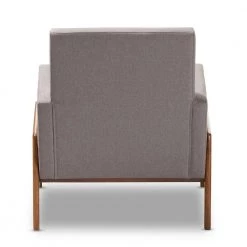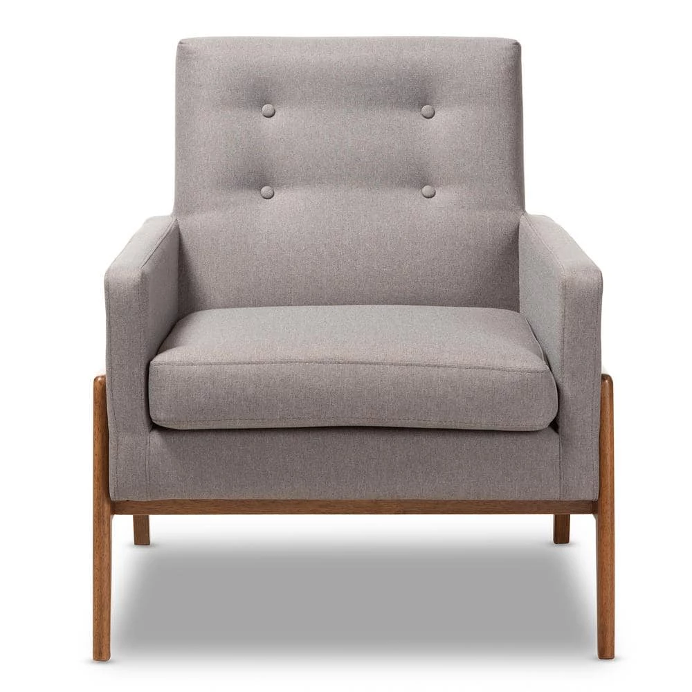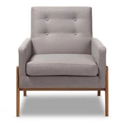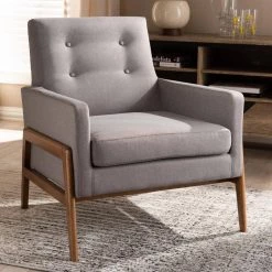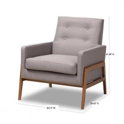 Add stylish and comfortable seating to your space with the Perris lounge chair. Inspired by mid-century modern design, the chair showcases curves in its arms and back, as well as a low-profile. The Perris is constructed from solid rubberwood and is foam-padded and upholstered in a sophisticated dark fabric. The chair features a brown walnut frame for a streamlined look, while subtle button-tufting on the back adds a touch of elegance. Place this retro style chair in the living room, reception area, or any other shared space. The Perris lounge chair is made in Malaysia and requires assembly.