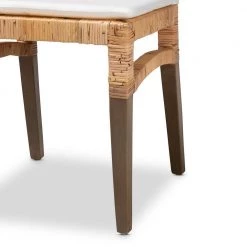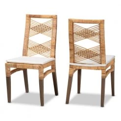 Rejuvenate the allure of your dining space with the tropical tones of the Poltak dining chair. Made in Indonesia, this chair is comprised of a sturdy mahogany wood frame wrapped in natural rattan. Each seat features a plush, fabric upholstered cushion for superb comfort while slim, intersecting rattan rods form the exquisite backrest. The Poltak will arrive fully assembled and utilizes angled back legs for excellent stability and support. Presenting exotic character in a sleek silhouette, the Poltak dining chair enhances any dining occasion. Due to the nature of the natural materials used in this product, it may have variations in areas such as, but not limited to, color, pattern, grain and texture. The hair-like strands of rattan/rattan-fiber are common due to nature of the material.