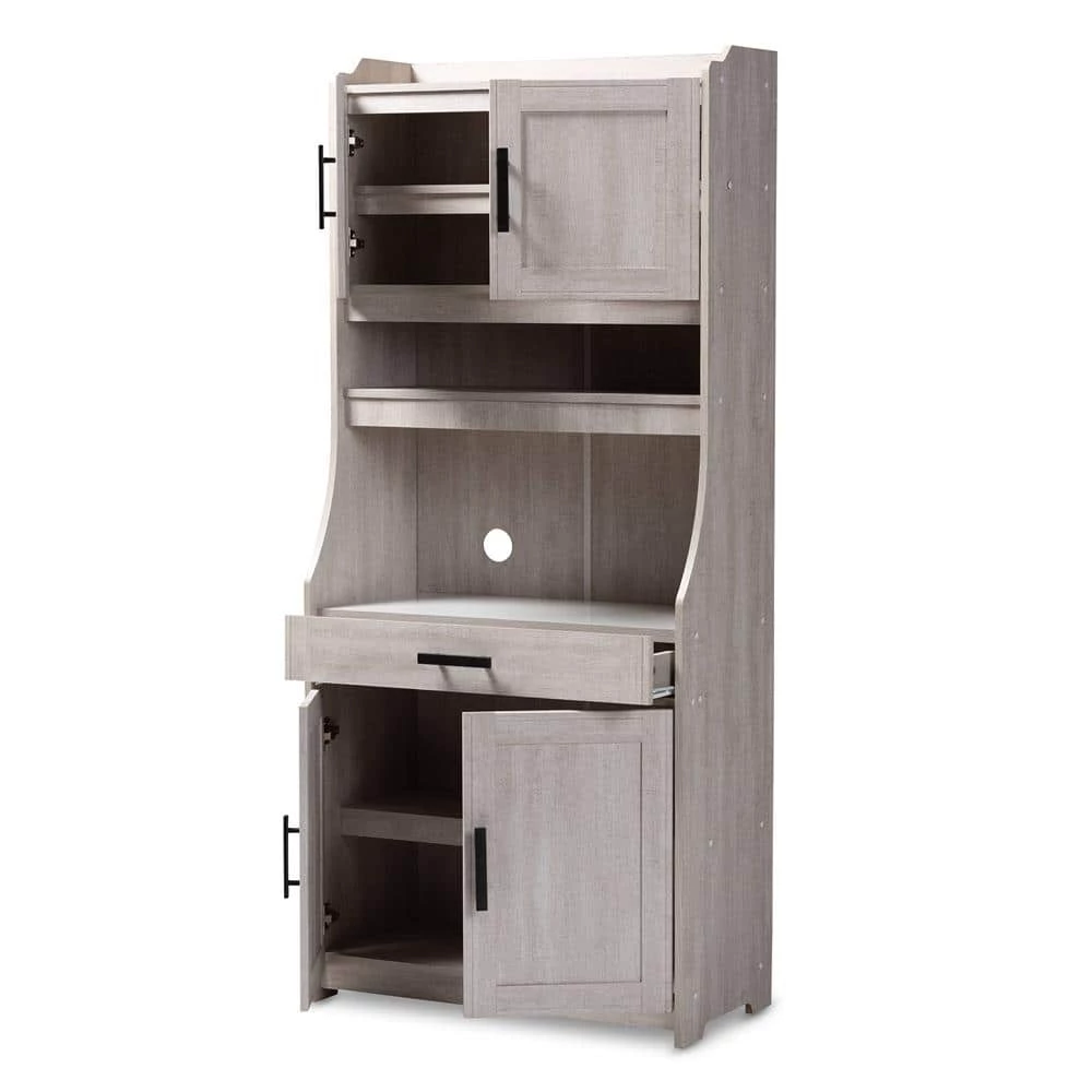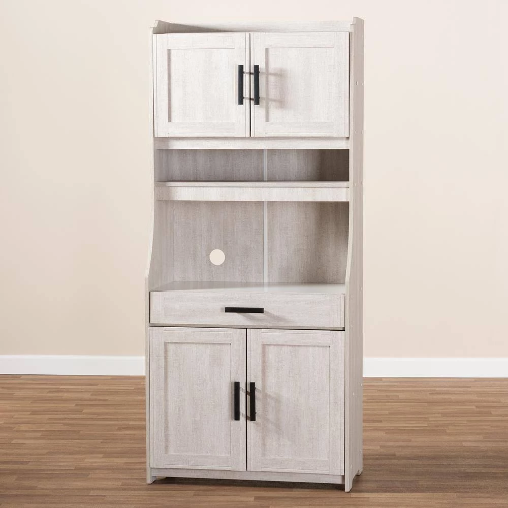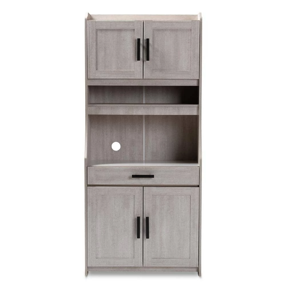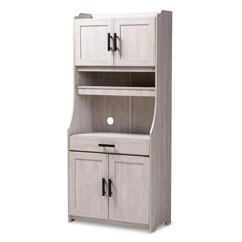 Featuring a neutral finish and ample storage space, the Portia cabinet is a practical addition to any kitchen. This MDF wood cabinet features two shelves at the top, concealed behind a pair of doors, with space to store plates and glassware. Additional storage is found in two concealed shelves at the bottom of the cabinet. An open compartment in the middle of the cabinet is ideal for storing a microwave, blender, or other appliances. This compartment is fitted with a circular cut-out to enable easy concealment of appliance cables and wires. The Portia is also built with a drawer for utensil storage, as well as an open shelf for additional plate and glassware storage. Black metal handles on the doors and drawer complete the look. The solution to stylish and convenient kitchen storage lies within the Portia cabinet. The Portia cabinet is made in Malaysia and requires assembly.