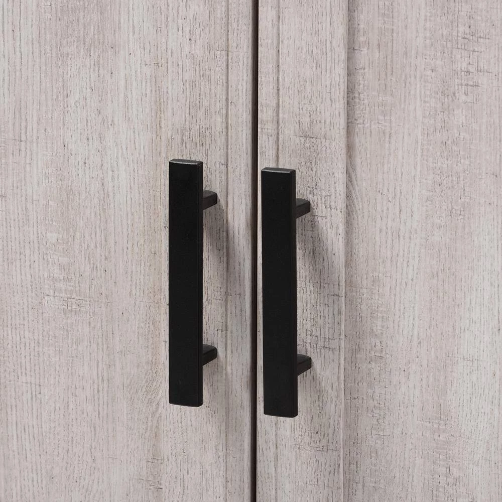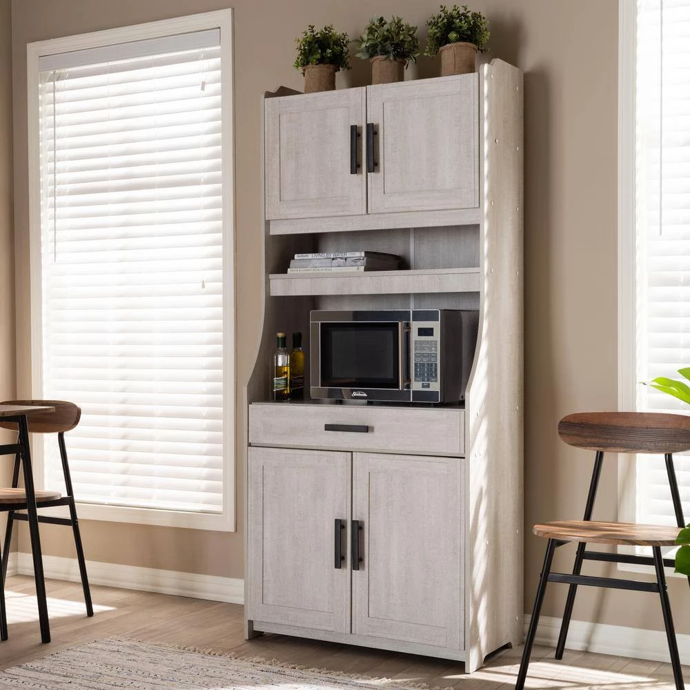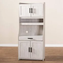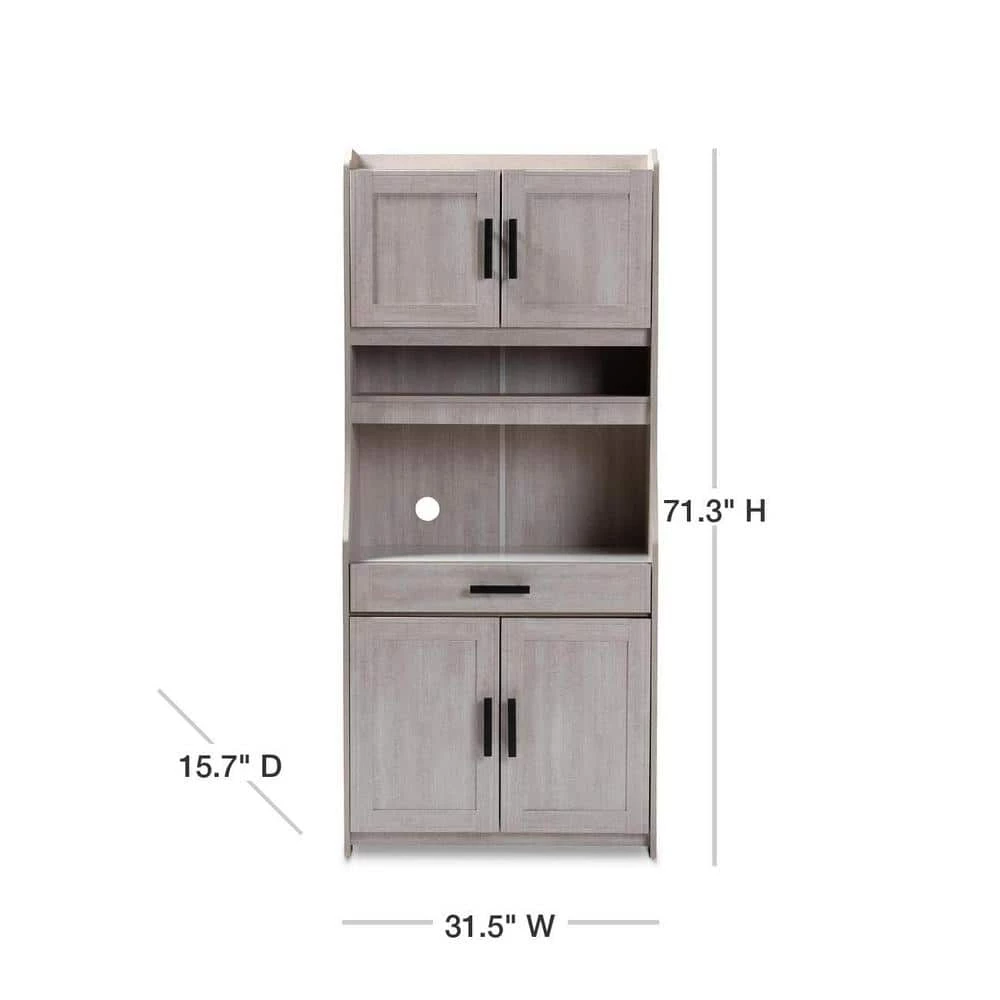 Featuring a neutral finish and ample storage space, the Portia cabinet is a practical addition to any kitchen. This MDF wood cabinet features two shelves at the top, concealed behind a pair of doors, with space to store plates and glassware. Additional storage is found in two concealed shelves at the bottom of the cabinet. An open compartment in the middle of the cabinet is ideal for storing a microwave, blender, or other appliances. This compartment is fitted with a circular cut-out to enable easy concealment of appliance cables and wires. The Portia is also built with a drawer for utensil storage, as well as an open shelf for additional plate and glassware storage. Black metal handles on the doors and drawer complete the look. The solution to stylish and convenient kitchen storage lies within the Portia cabinet. The Portia cabinet is made in Malaysia and requires assembly.
