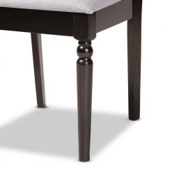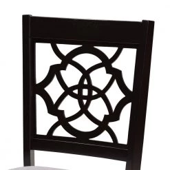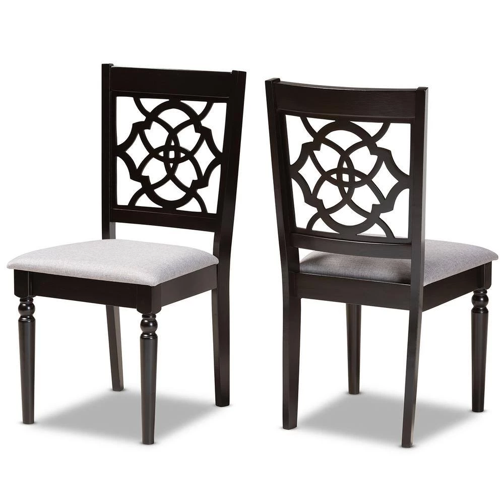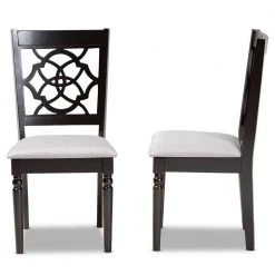 Elegant design marries quality craftsmanship in the Renaud dining chair. Made in Malaysia, the Renaud is constructed from solid wood and showcases a rich dark brown finish that complements the grey fabric upholstery. Ample dining comfort is provided by the plush, foam padded seat. Requiring assembly, the back features a unique cut-out design that allows light to flow through, providing a more open feel in tight spaces. Ring-turned legs add a classic, refined touch. Well suited for both casual meals and formal dinner parties, the Renaud dining chair enhances any dining experience.