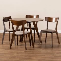 Comfortable and elegant, the Rika dining is designed for the modern home. Made in Malaysia, the Rika is constructed from durable wood and comfortably seats up to four. The walnut brown finished wood and round tabletop lend modern style while giving each member of the table plentiful elbow room. Assembly is required and each chair is padded with foam underneath a layer of soft fabric for comfort. With its compact size, the Rika dining set is well suited for smaller nooks and dining spaces.