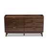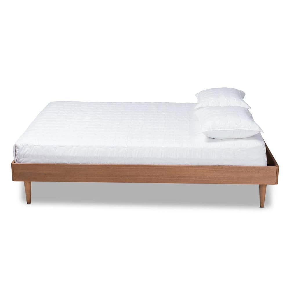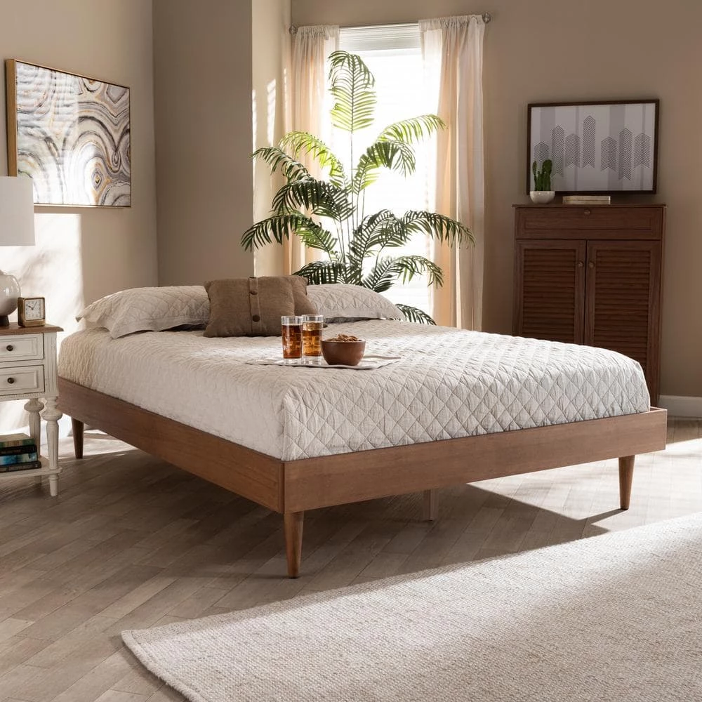 Cultivate a vintage chic vibe in your bedroom with the Rina bed frame. Constructed from wood, the Rina features a classic walnut brown finish that adds warmth to any space. Its low platform and tapered legs are reminiscent of cool, mid-century modern style. Add some crisp white sheets and plush duvet to complete the look. The Rina bed frame is made in Malaysia and requires assembly.