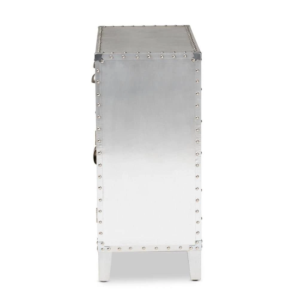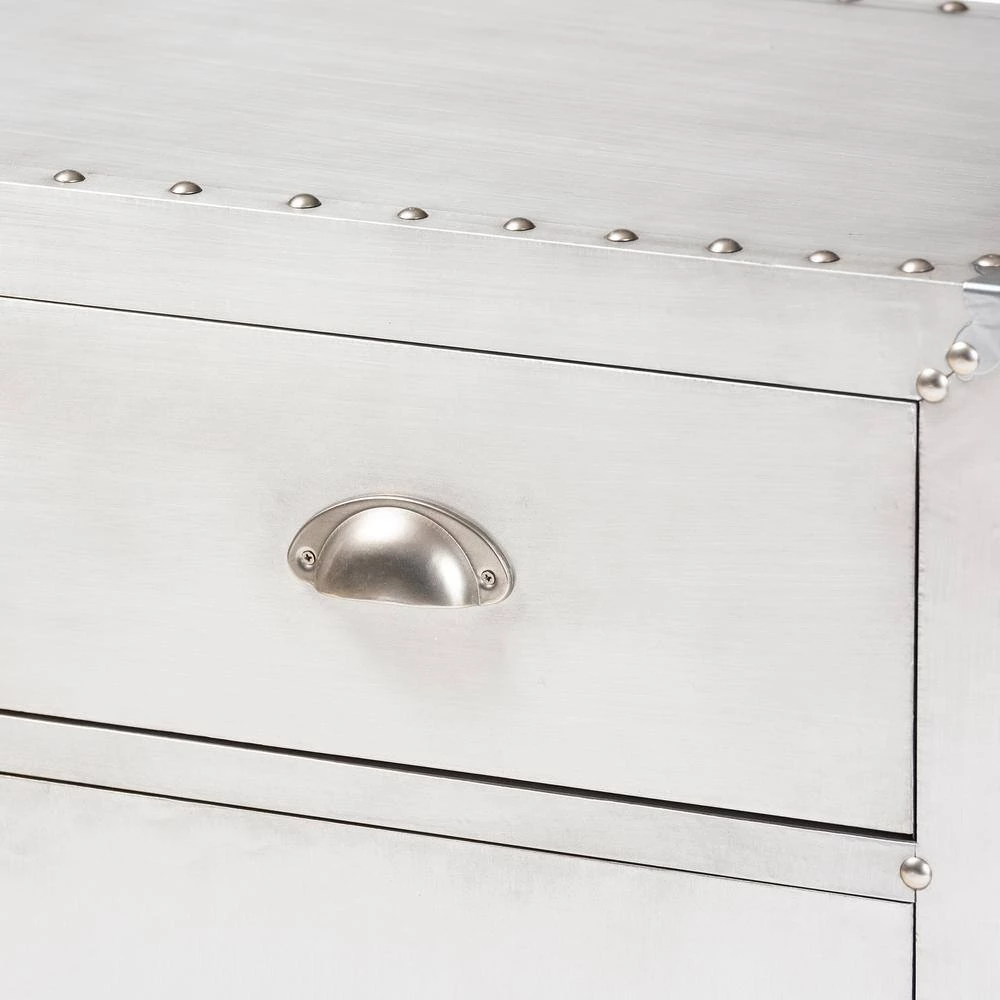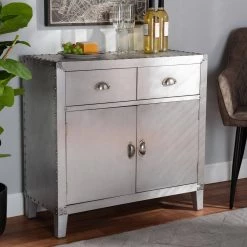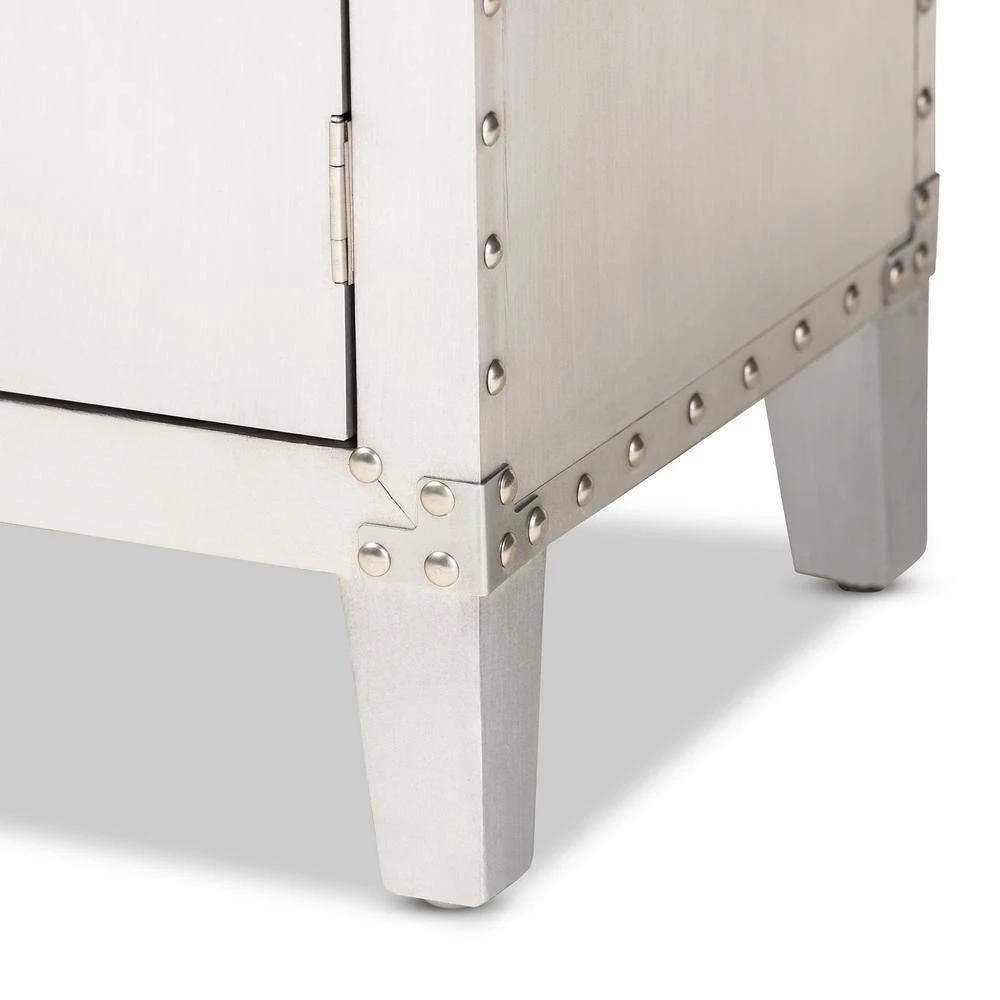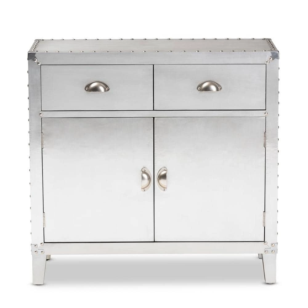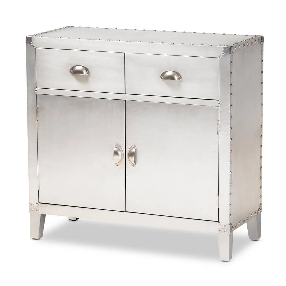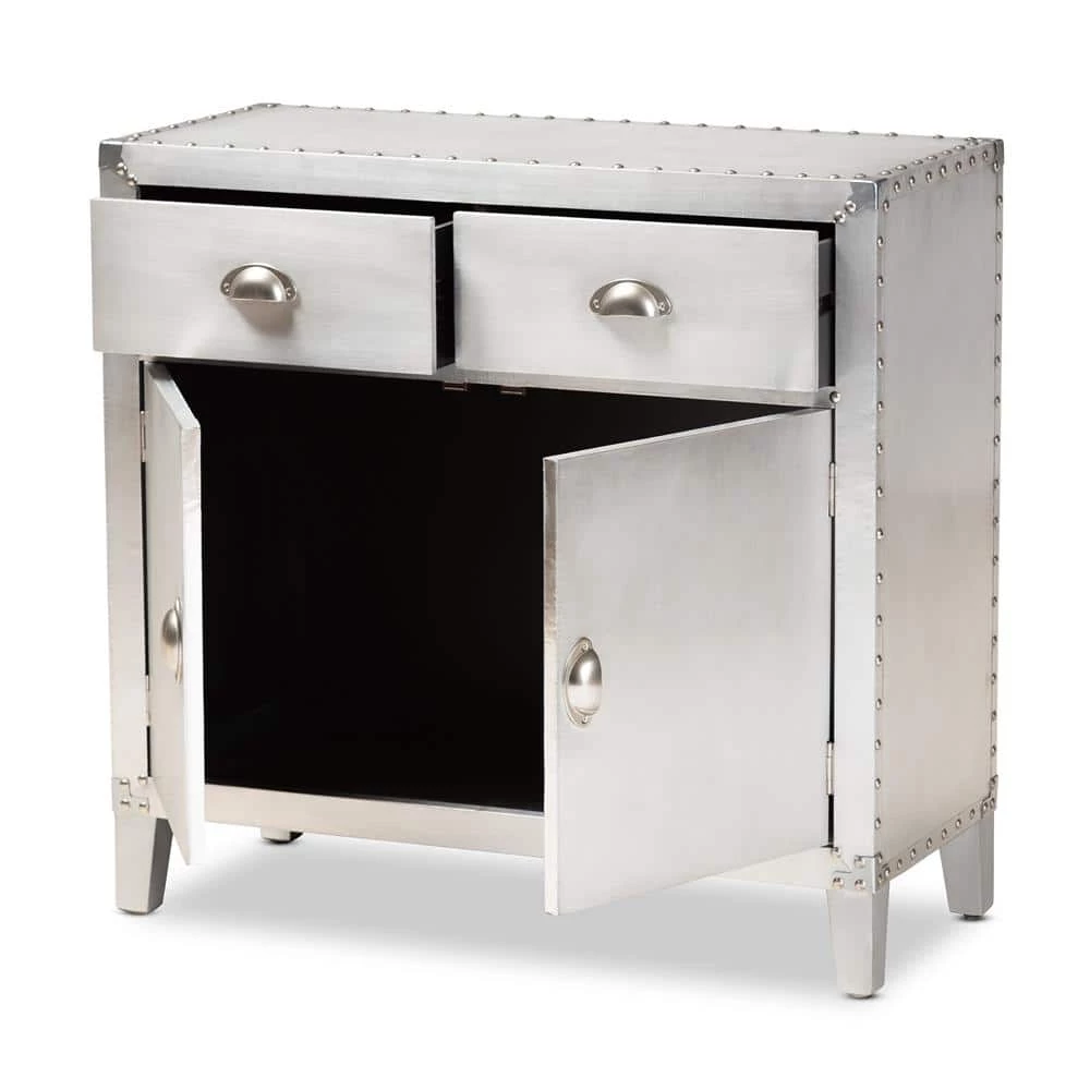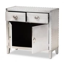 Bring chic industrial style into your space with the Romain cabinet. Constructed from wood and metal, the Romain features two drawers and one concealed compartment, behind two doors, to keep items organized and out of sight. Polished silver metal drawer handles add a sleek touch. Inspired by vintage storage trunks, the Romain is embellished with rivets and corner protectors. This unique piece is well suited for a living room, bedroom, or entryway. The Romain cabinet is made in China and will arrive fully assembled.