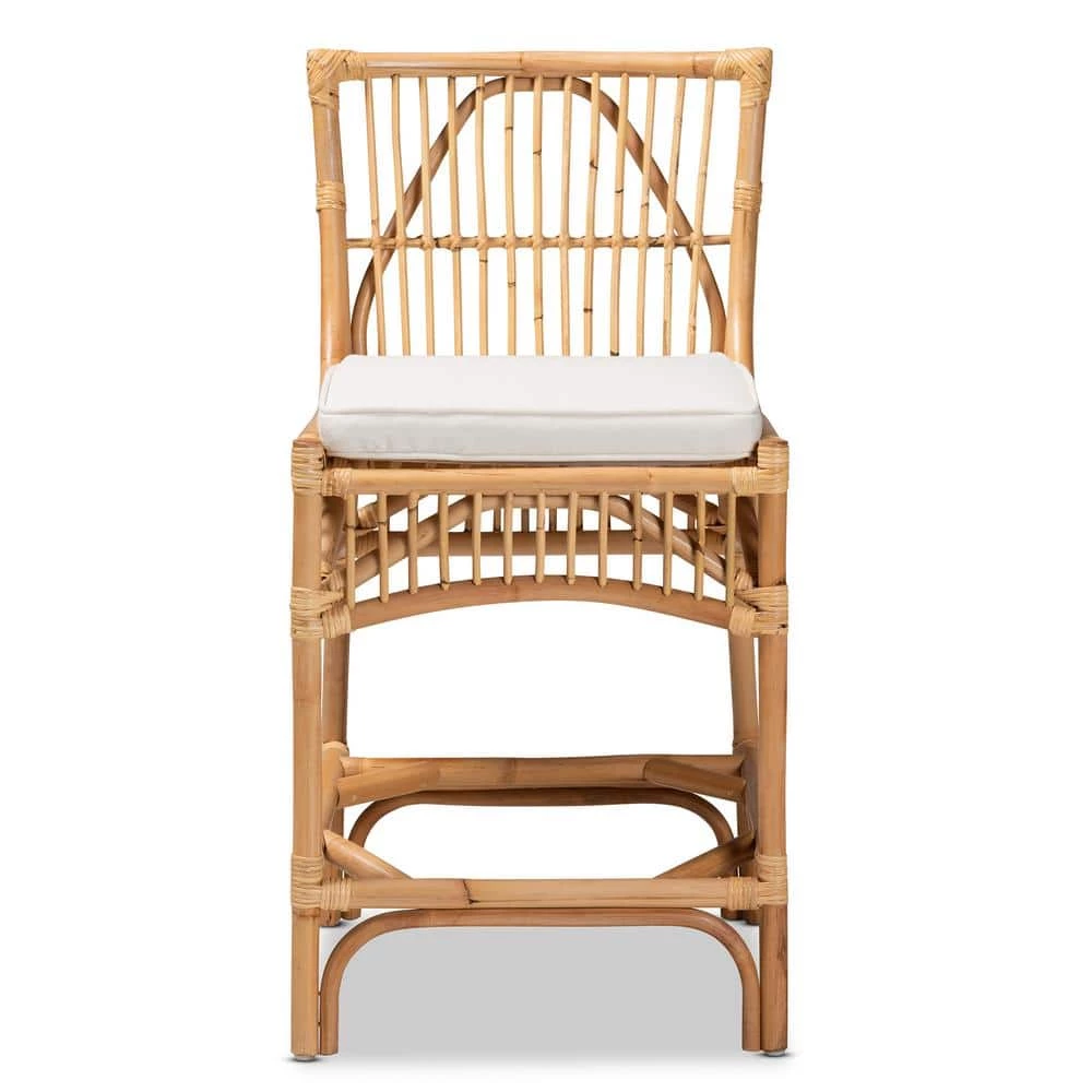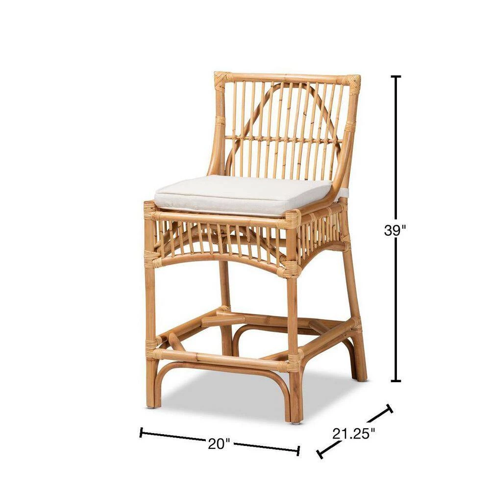 The carefree charm of the Rose counter stool brings a soothing atmosphere to any space. Made in Indonesia, this stool is comprised of a natural rattan frame adorned with bamboo-like embellishments. Its seat features a plush cushion padded with soft foam and upholstered in smooth fabric for exceptional comfort. The Rose will arrive fully assembled and features an ergonomic footrest on each side to accommodate any occasion. With an exquisite outline and laidback design, the Rose counter stool lends a tranquil ambiance to any home bar or lounge.This is a product of nature and may have variations in areas such as, but not limited to, color, pattern, grain and texture. The hair-like strands of rattan/rattan-fiber are common due to nature of the material.