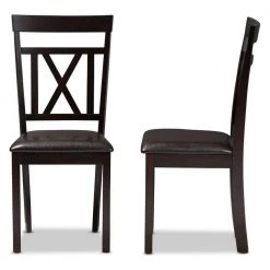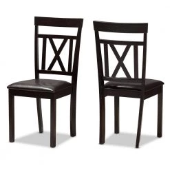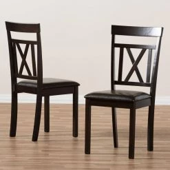 Our Rosie modern and contemporary 2-piece dining chair set celebrates simplicity by combining timeless and contemporary elements. The chairs high, X-back design offers comfort and grace. Dark-brown, wenge-finished wood matches perfectly with dark brown faux leather padded seats. Featuring tapered legs, the Rosie imbues modern essence. Made in Malaysia, the Rosie dining chair requires assembly.
