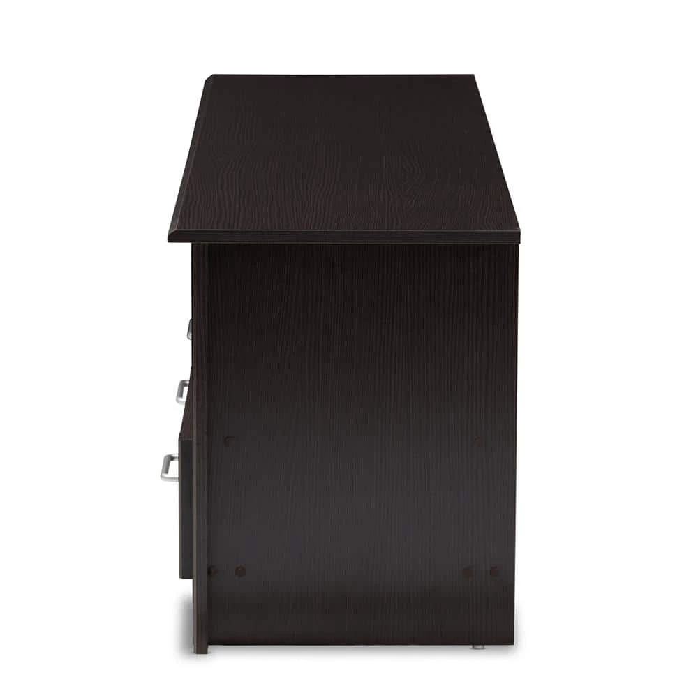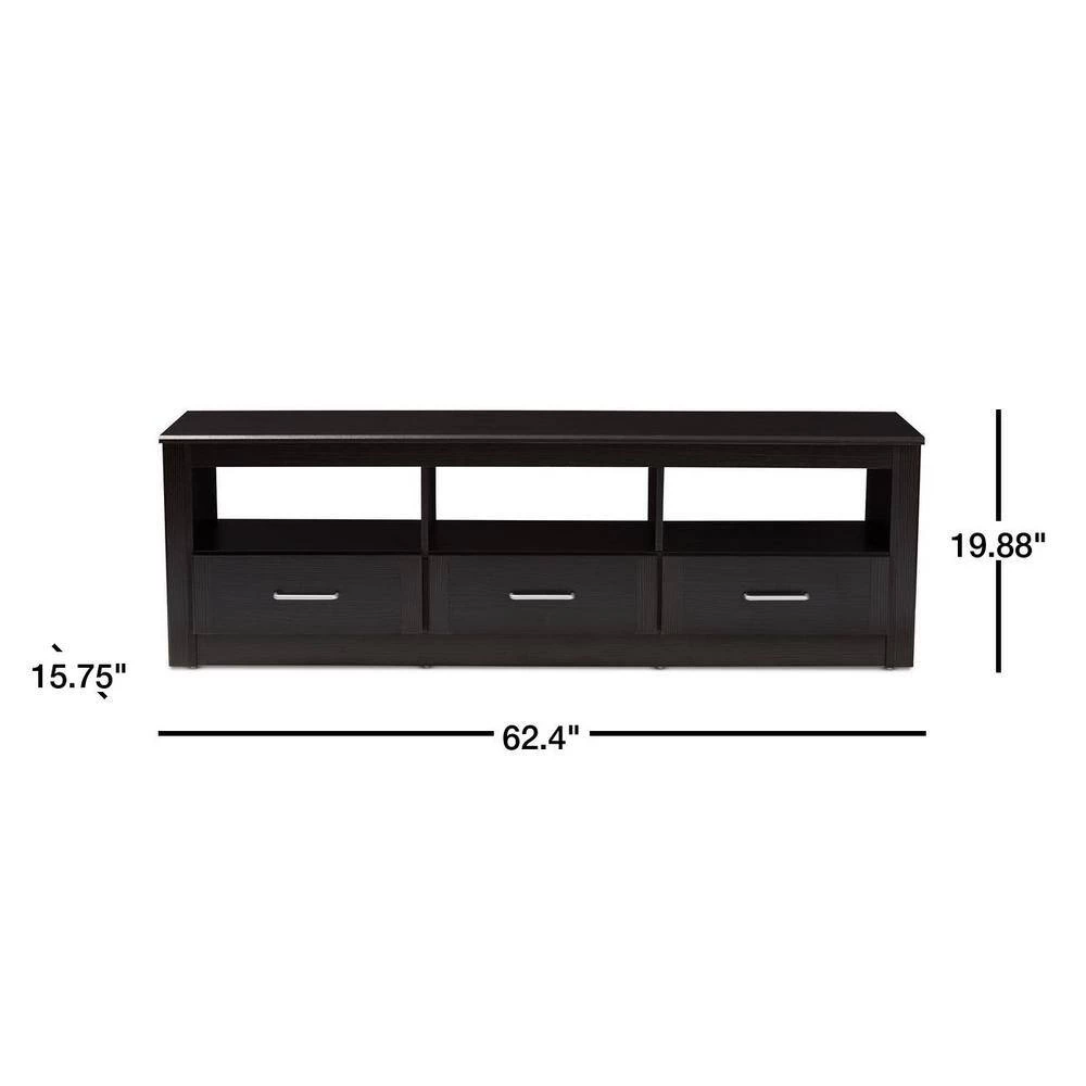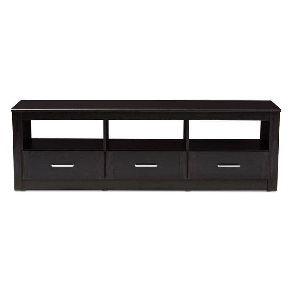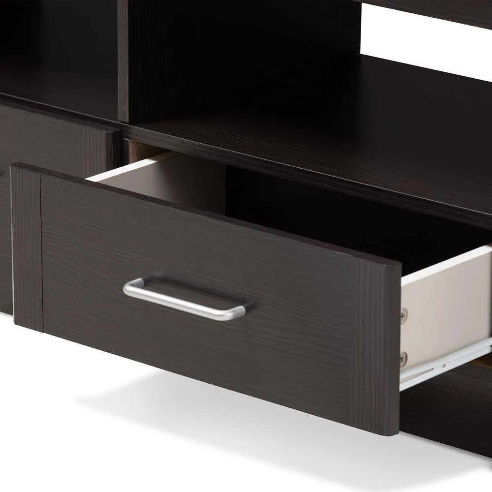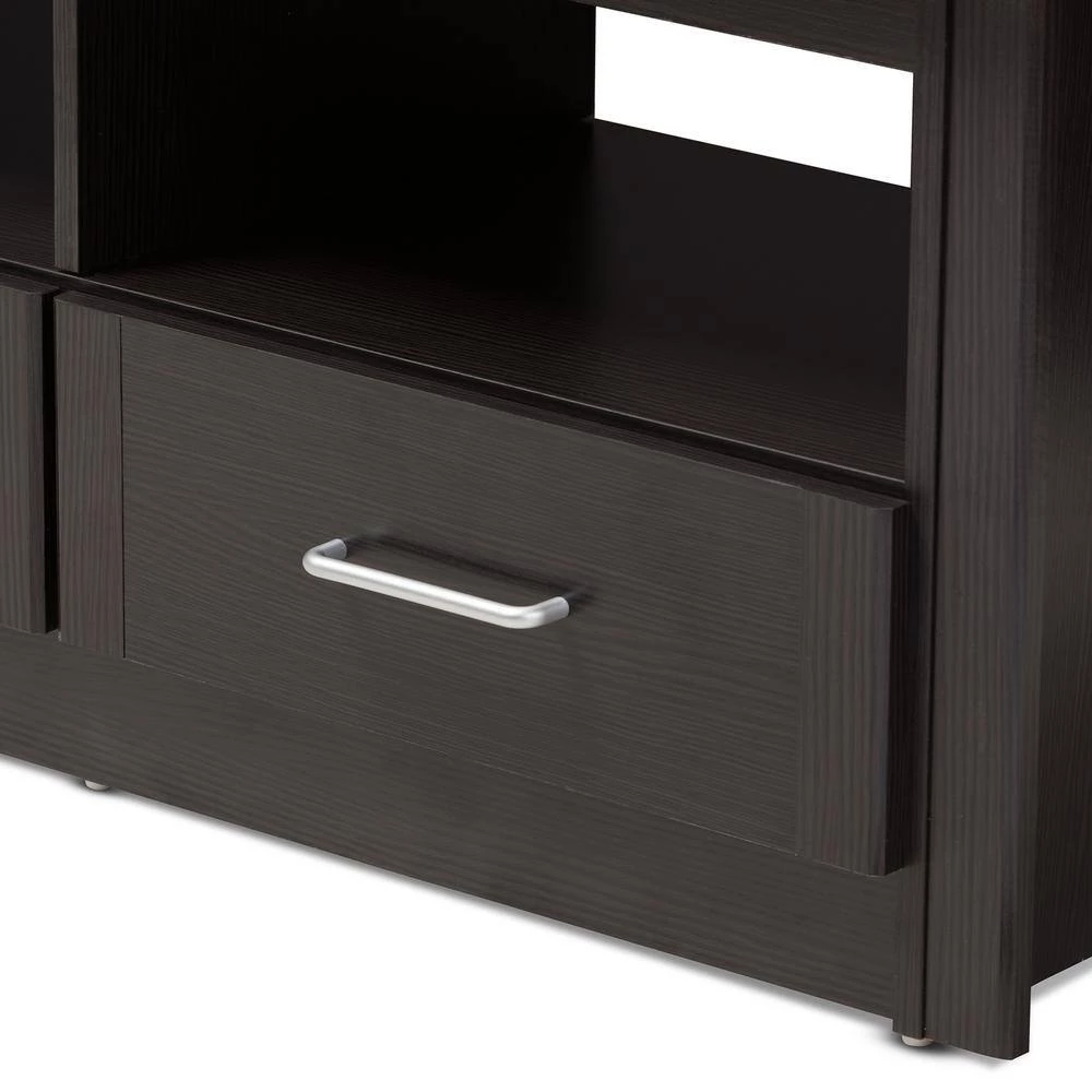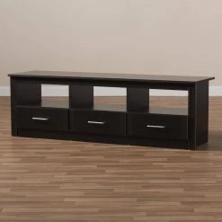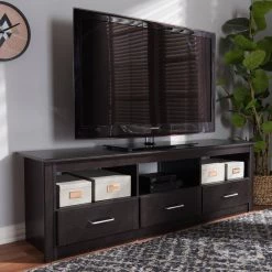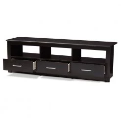 The Ryleigh TV stand is the practical and stylish solution to your livingroom’s organization needs. The modern and contemporary-inspired design features a clean, rectangular silhouette. The Ryleigh is finished in a wenge brown, making it easy to coordinate with a wide range of decor. The TV stand has a wide top space, ideal for multiple television set sizes. The Ryleigh has three open shelf spaces, with three pull-out drawers directly underneath. The drawers feature silver finished handles. All of this shelf and drawer space makes it easy to store entertainment media, such as DVDs and video games. Practical, stylish, and with plenty of open space for cord management, the Ryleigh can easily bring together your living room, rec room, or gaming set-up. Made in Malaysia, this TV stand requires assembly.