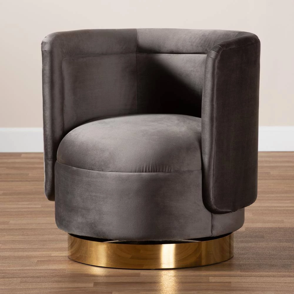 Retro glamour meets modern comfort in the Saffi accent chair. This chic piece is upholstered in a rich velvet fabric that feels exceptionally soft to the touch. Its barrel silhouette creates a cozy embrace, further amplified by its playful swivel base. Showcasing a striking gold-tone finish on its base, the Saffi will add a truly luxurious feel to any living room, den, or bedroom. The Saffi accent chair is made in China and will arrive fully assembled.