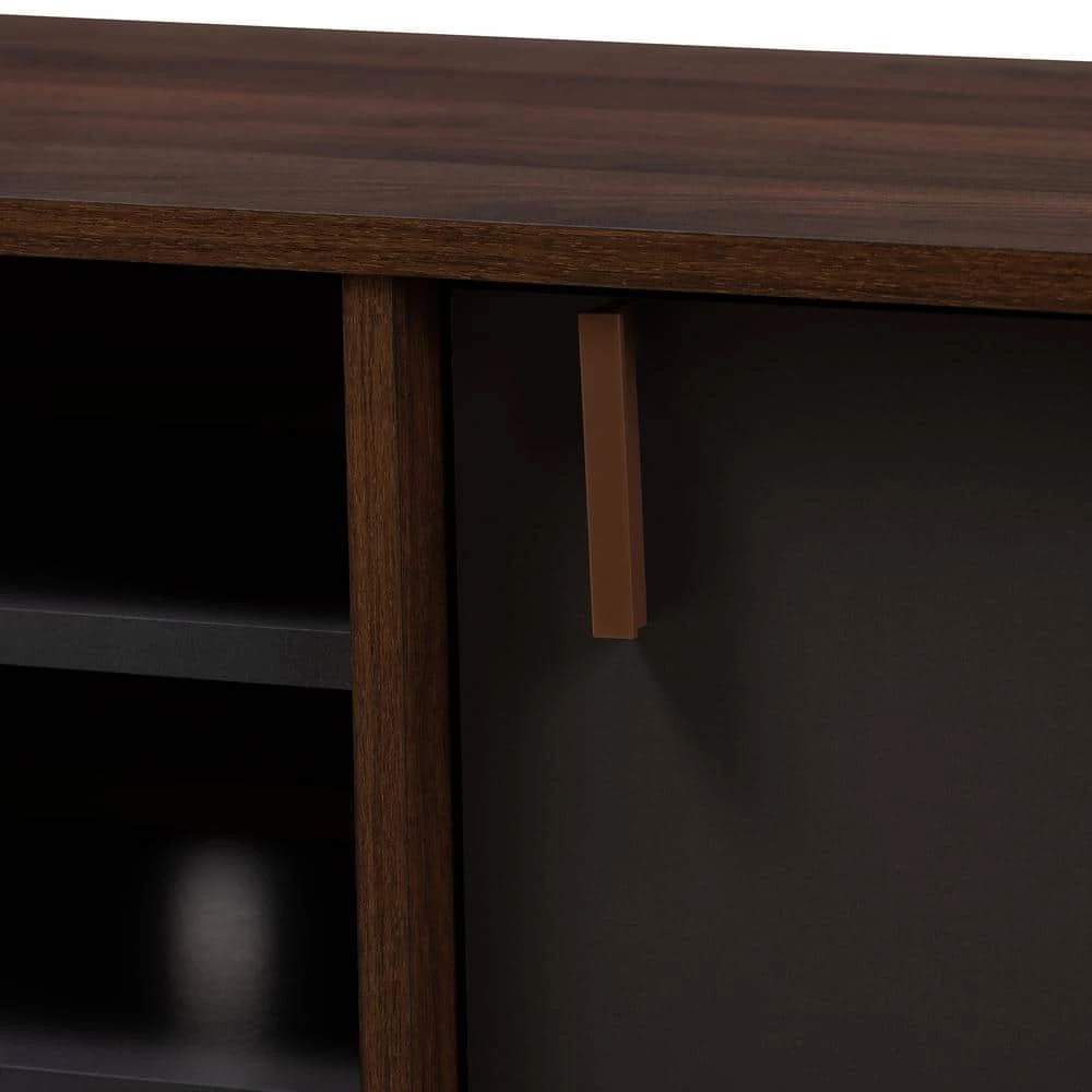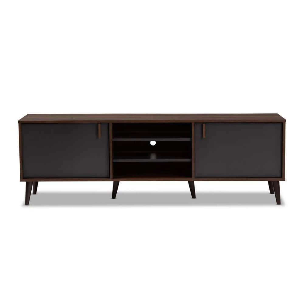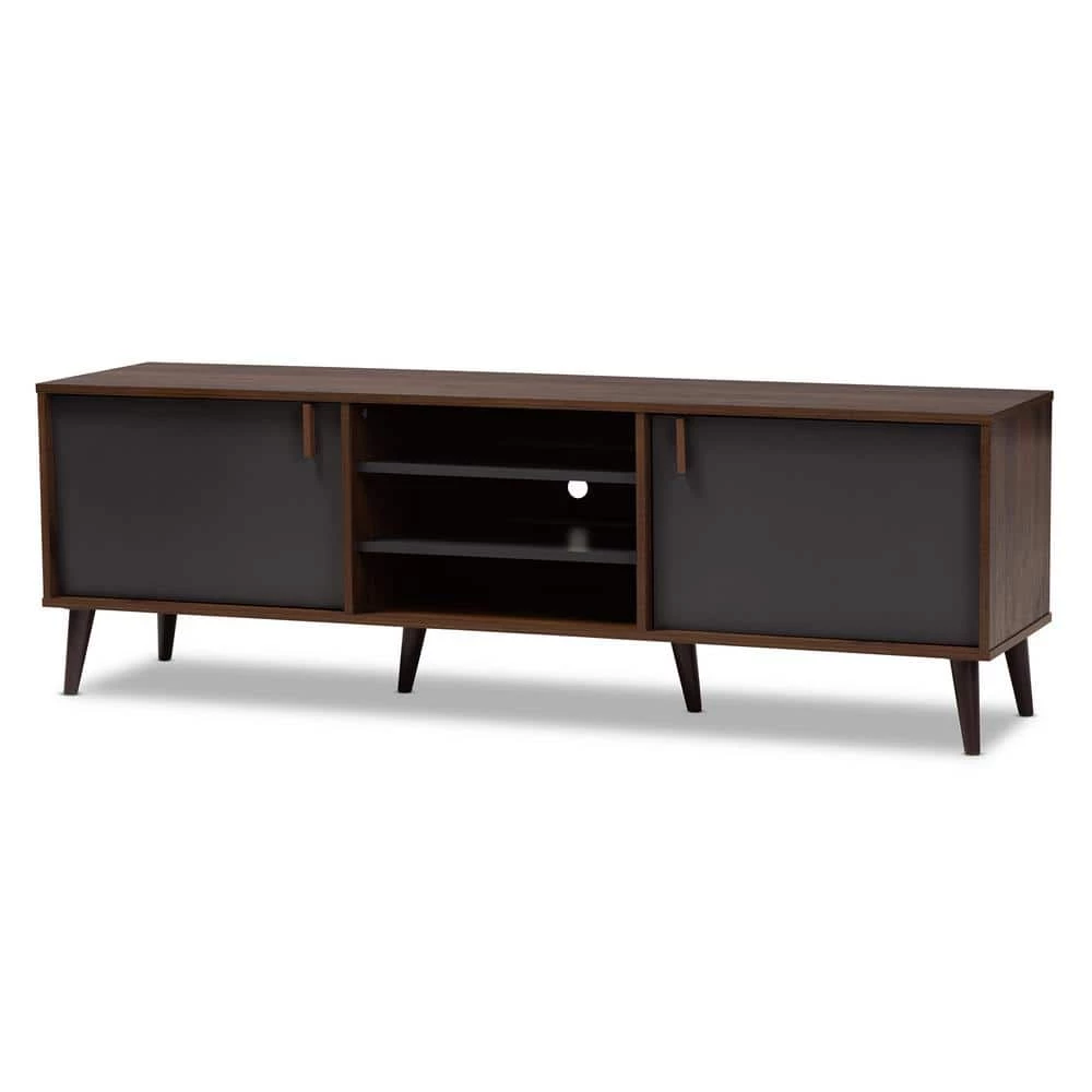 Organize your entertainment space in style with the Samuel TV stand. The modern and contemporary-inspired design elements come through in the straight lines and solid colors of the television stand. The Samuel’s engineered wood frame is finished in brown with dark grey finished doors. This TV stand features five shelf spaces, three of which are in the center, with one space on each side behind a door. The back panel of the Samuel has circular cut-outs for wire management, making it easy to arrange and store your gaming consoles and media players. The TV stand rests on stylishly angled, tapered legs. Add some chic and sophisticated style to your livingroom or rec room with the Samuel TV stand. Made in Malaysia, the TV stand requires assembly.