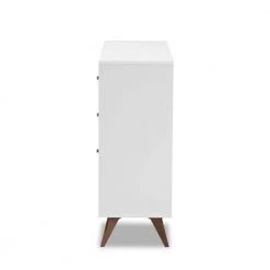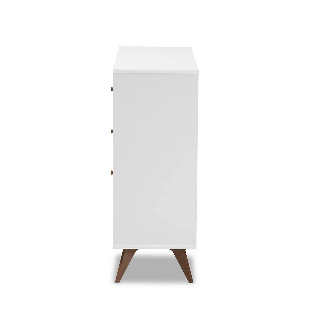 Display your wine collection in style with the Savino wine cabinet. The Savino is constructed from durable engineered wood and displays a sleek finish. The cabinet features built in wine racks that can accommodate storage for up to twelve bottles of wine. Four drawers provide additional storage for bottle openers, wine stoppers, and more. Inspired by mid-century modern design, the cabinet showcases angled, tapered feet. The Savino wine cabinet is made in Malaysia and requires assembly.