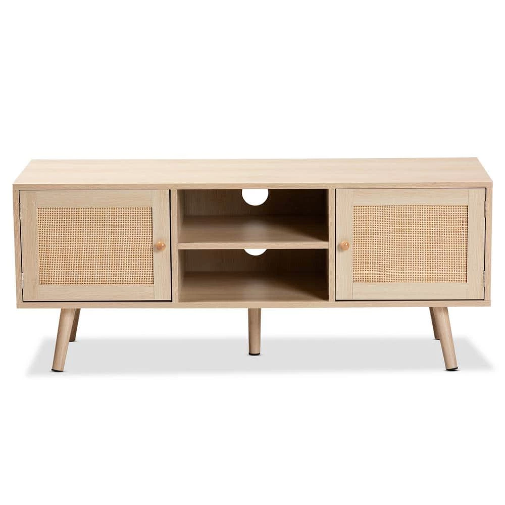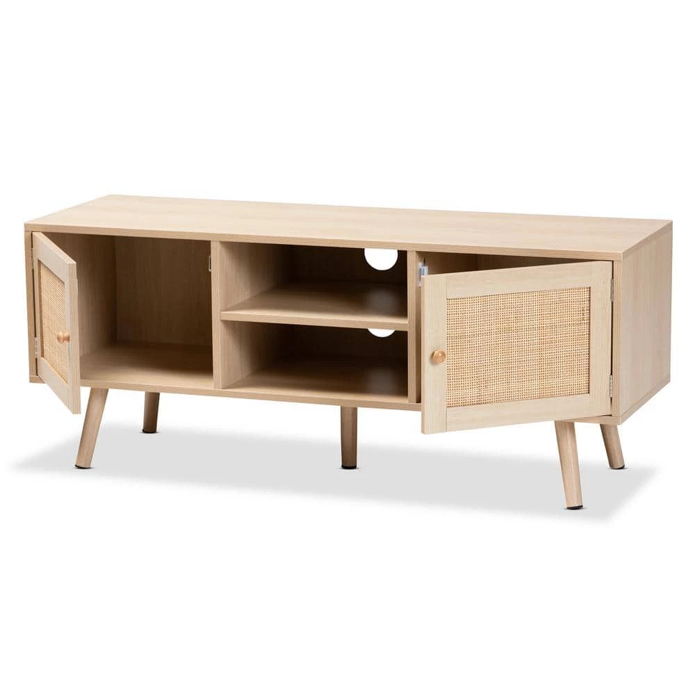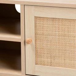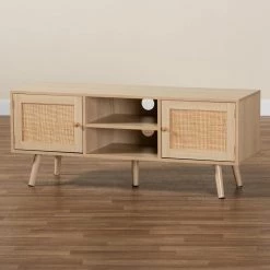 Dressed in the timeless aesthetic of the mid-century, the Sebille TV stand gives your living room an attractive yet versatile focal point. Made in China, this handy piece is comprised of a sturdy wood frame adorned with natural rattan accents. Two open shelves provide space to organize media devices, while two additional shelves behind the doors offer secure storage space. Requiring assembly, the Sebille features two cord management holes on its back panel that enable quick and easy setup. Carrying the appeal of classic design to the modern era, the Sebille TV stand fits right at home in any living room layout.Due to the nature of the natural materials used in this product, it may have variations in areas such as, but not limited to, color, pattern, grain and texture. The hair-like strands of rattan/rattan-fiber are common due to nature of the material.
