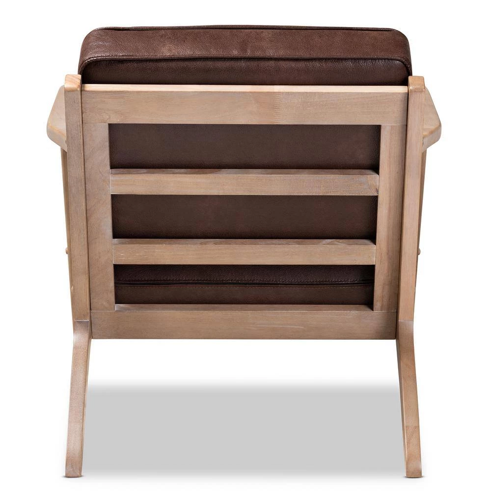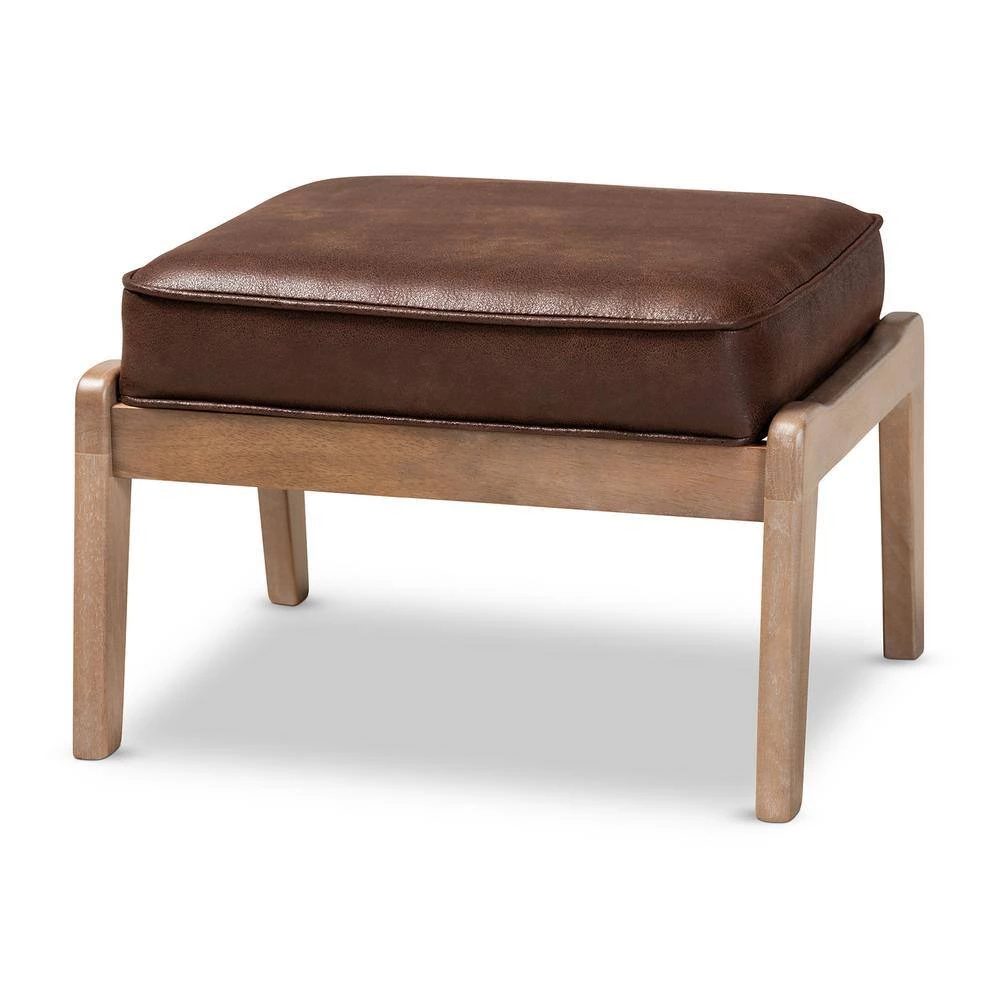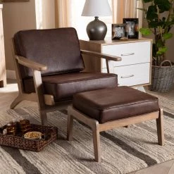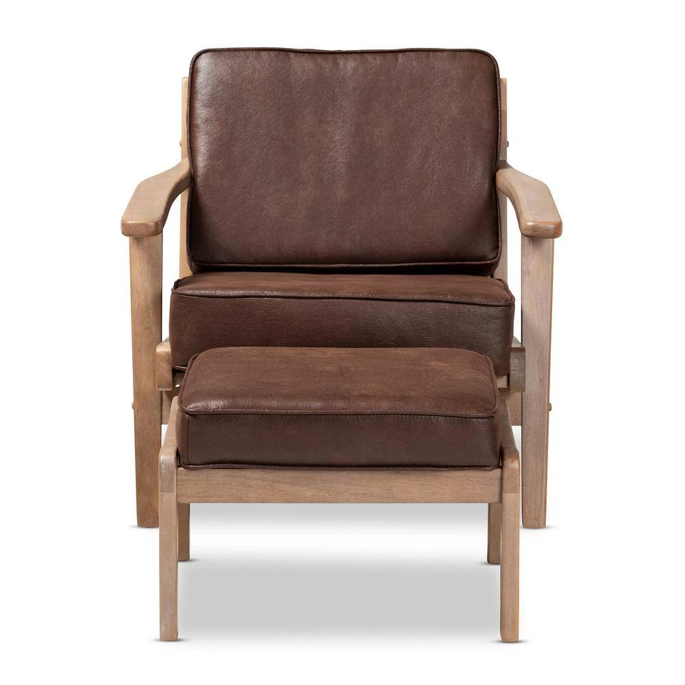 Create a cozy retro reading alcove in your living space with the Sigrid armchair and ottoman set. Inspired by mid-century modern design each piece features a low profile and angular frame. Dark brown faux leather effect fabric upholstery gives the pieces a sleek look that complements the antique oak finish on the solid rubberwood frames. It’s thick foam-padded cushions provide comfort for years to come. Striking from any angle the Sigrid set is well suited for both private residences and public office spaces. The Sigrid armchair and ottoman set is made in Malaysia and requires assembly.