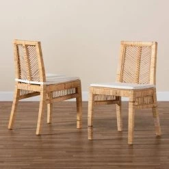 Invoke the appeal of a tropical paradise in your space with the remarkable Suci dining chair. Made in Indonesia, this chair is comprised of a sturdy mahogany wood frame wrapped in natural rattan. Each seat features a plush, fabric upholstered cushion for superb comfort while slim rattan rods form an eye-catching yet smooth backrest. The Suci will arrive fully assembled and utilizes angled legs for excellent stability and support. Boasting a simple yet expressive design inspired by exotic aesthetics, the Suci dining chair stands out as an exquisite addition to any dining space. Due to the nature of the natural materials used in this product, it may have variations in areas such as, but not limited to, color, pattern, grain and texture. The hair-like strands of rattan/rattan-fiber are common due to nature of the material.
