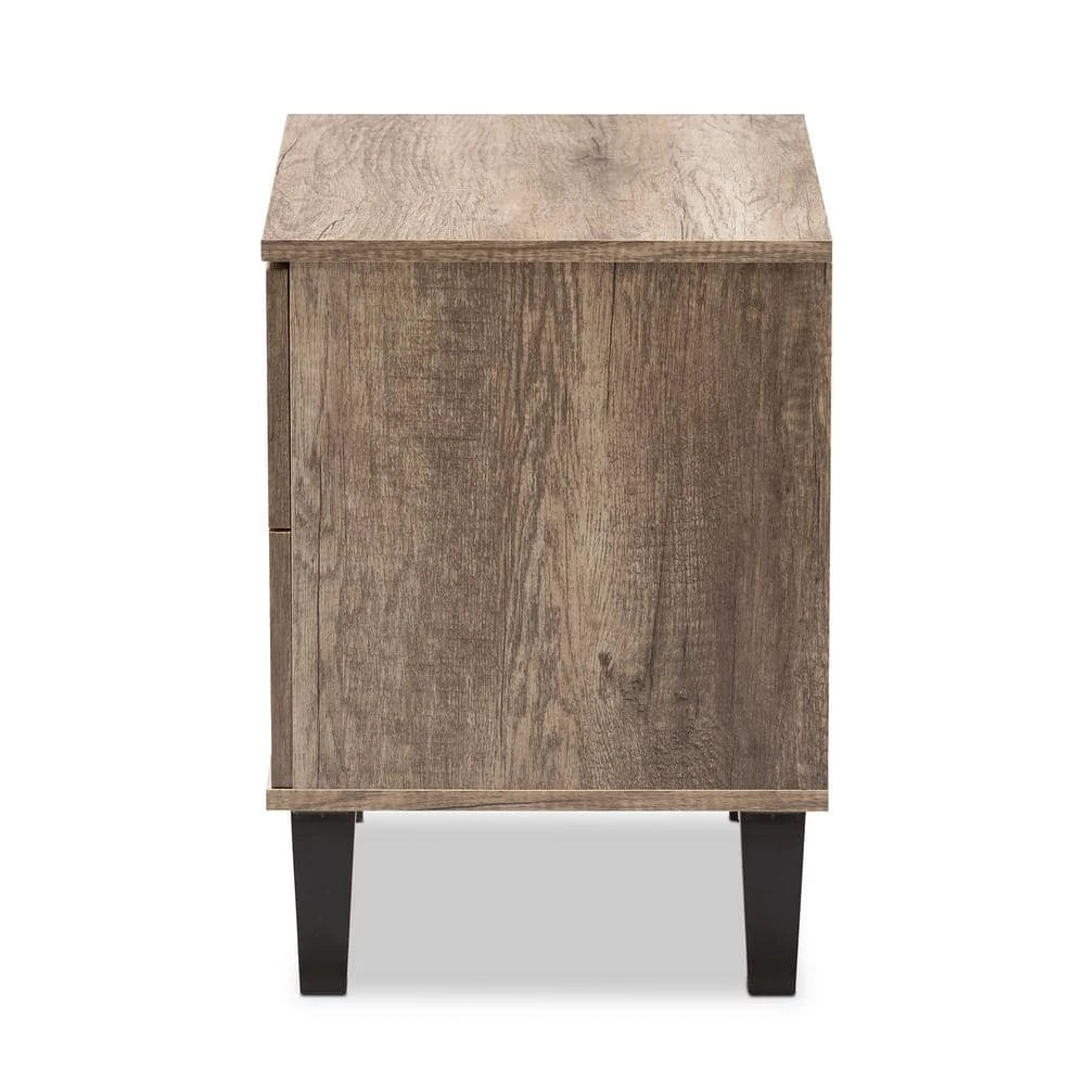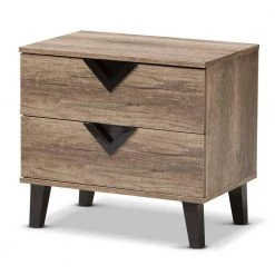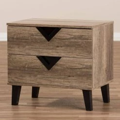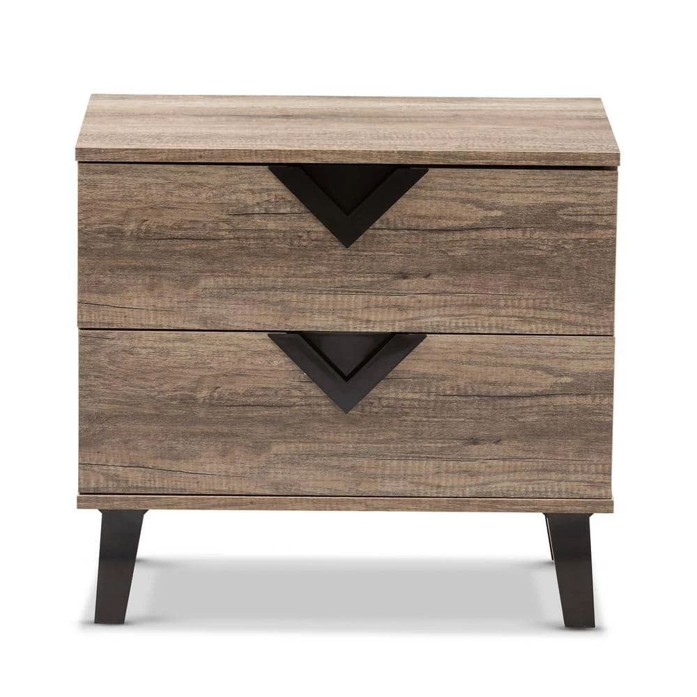 The Swanson nightstand combines function and modern style. On a geometric silhouette, this oak veneered nightstand features two drawers with black triangle vinyl handles. The angled legs in black, supporting the nightstand while contrasting with the oak veneered finishing showcase the modern look. Constructed of engineered wood, the nightstand is built to last. The bedside table comes with two drawers for storing your bedroom essentials. The under clearance area allows you to dust as often to keep the area clean. Made in Malaysia, the Swanson nightstand requires assembly.