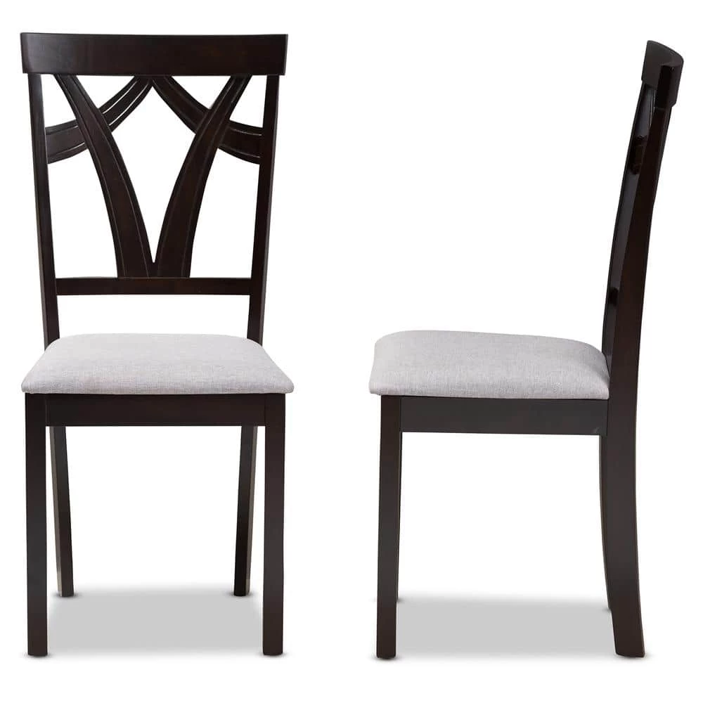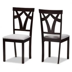 Versatile palette and contemporary form for a dynamic piece in your dining room, the Sylvia set of two dining chair set features practical casual dining chairs for compact spaces. Constructed of solid rubberwood frame, the dining chair set is upholstered in grey polyester fabric, instantly updating your dining room for an on-trend look. Featuring geometric seat back, the Sylvia dining chair set is foam padded, ensuring comfortable seating experience while you enjoy dinners with friends and family. Made in Malaysia, the Sylvia requires assembly.