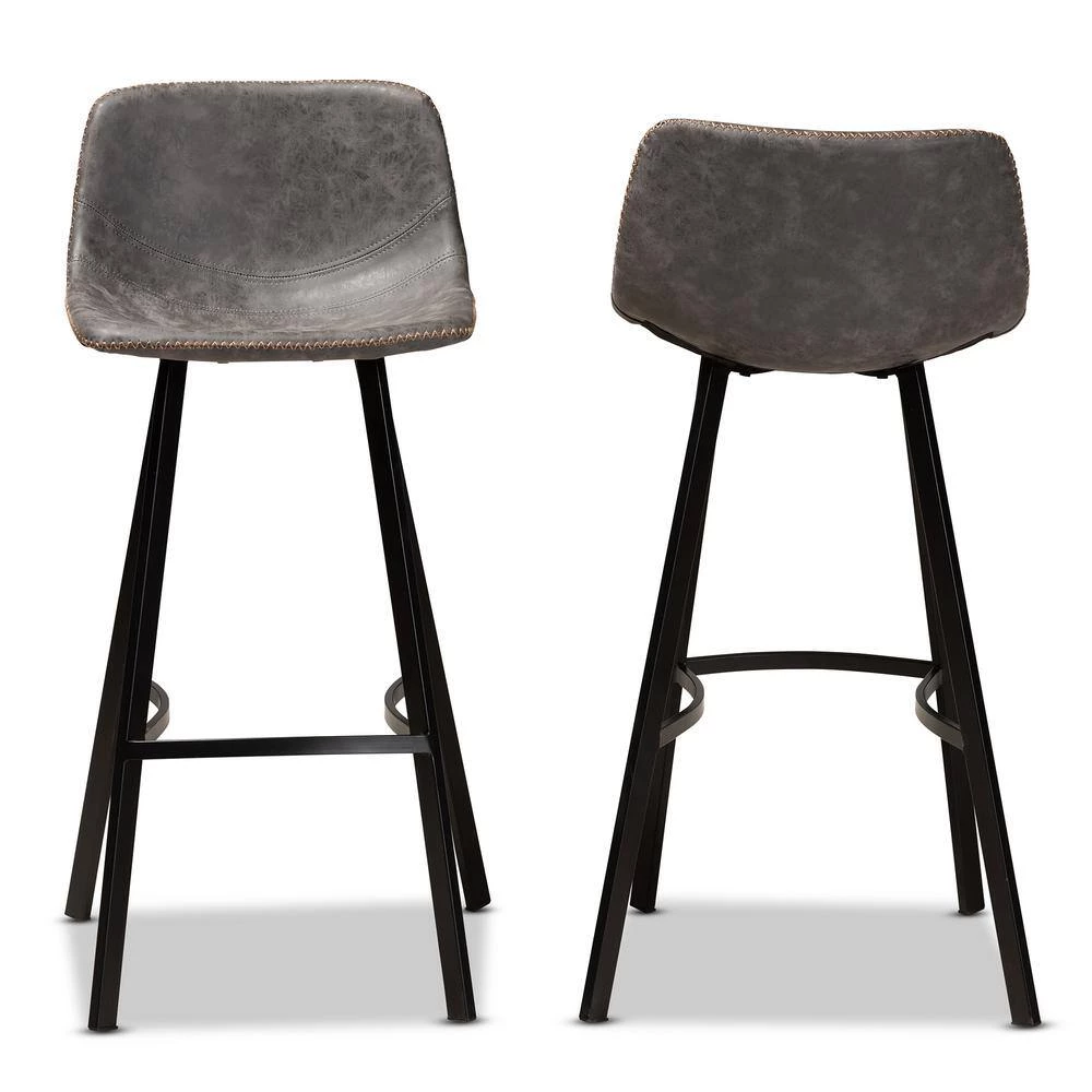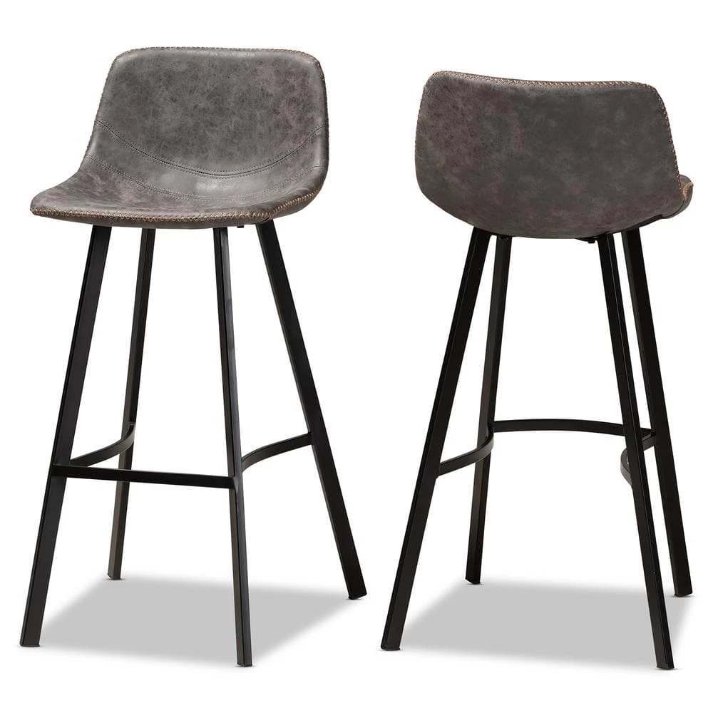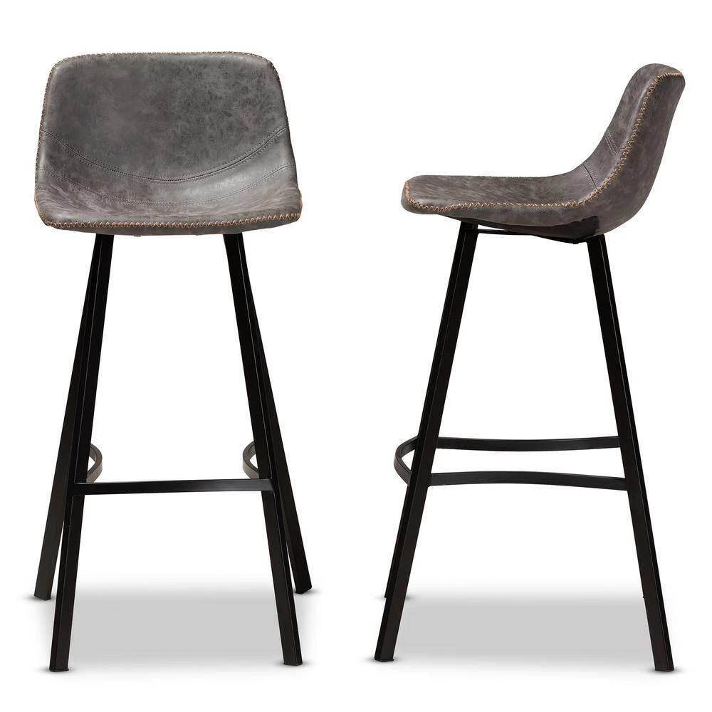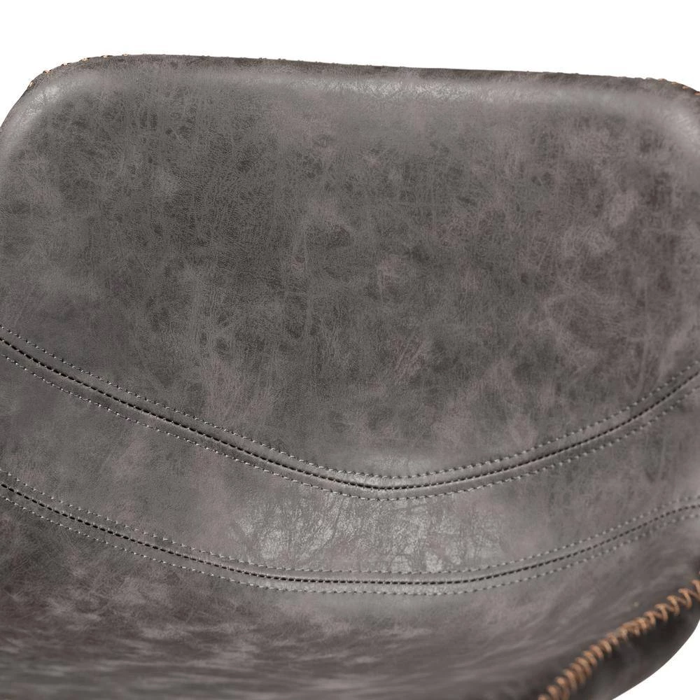 Add timeless style to your space with the Tani bar stool. Upholstered in a distressed grey and brown faux leather, the Tani features a wide, curved seat for the utmost comfort. Contrast stitching and whip stitching spruce up the rugged faux leather. Black metal legs provide solid support and give the Tani a cool industrial vibe. The Tani bar stool is made in China and requires assembly.