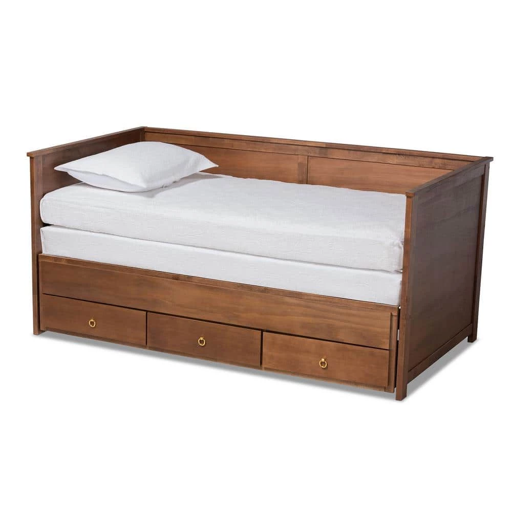 Create a cozy oasis in your home with the versatile Thomas daybed. Made in Malaysia, the Thomas can be swiftly converted from a twin size bed to a king size bed. Three drawers provide ample space to store clothes and toys. Gold-tone ring pulls add a touch of glam. Finished in a warm walnut brown, the fine wood craftmanship of the Thomas features inset paneling for a classic, elegant look. Assembly is required and a box spring isn’t necessary, as the daybed comes with internal slats for mattress support. Balancing form and function, the Thomas is an exceptional addition to the modern household.
