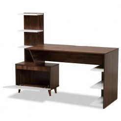Give your home office a flexible setup with the handy design of the Tobias desk. Made in Malaysia, the Tobias is crafted from sturdy wood featuring a contemporary 2-tone finish of white and walnut brown. Six shelves located at the sides provide ample surface area to organize and decorate your workspace. Requiring assembly, the Tobias is also equipped with concealed storage behind the door. Splayed legs lend a charming mid-century look. The versatile and sleek design of the Tobias desk modernizes any space.