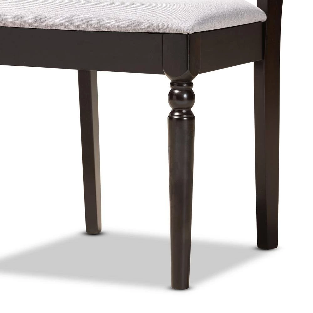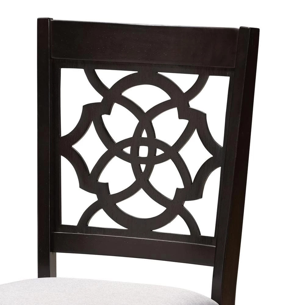 Contemporary style meets modern comfort with the Valerie dining set. Made in Malaysia, the Valerie includes 4-chairs and 1-table constructed from sturdy wood finished in a rich dark brown. Each chair features a unique cut-out design on its back and is fitted with a foam-padded cushion upholstered in smooth grey fabric. Requiring assembly, the circular tabletop allows ample elbow room for each member of the table. Perfect for both casual and formal occasions, the Valerie dining set easily elevates any dining experience.