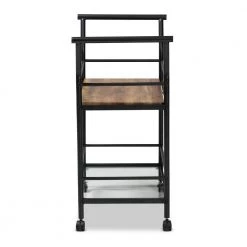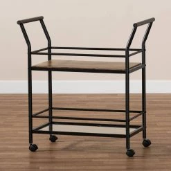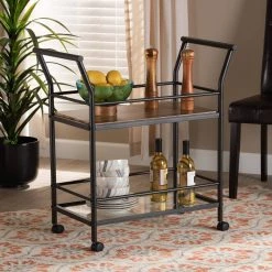 Serve and display your wine collection with the Valora wine cart. Made in China, this cart features two shelves that provide ample room to store plates, glassware and wine bottles. Each shelf is fitted with guard rails, ensuring that all your items will remain secure when the cart is in motion. Handles and wheel casters ensure smooth mobility. The walnut-finished wood and clear glass shelves contrast with the black metal frame to give the cart a cool, industrial vibe. Requiring assembly, the Valora wine cart adds style and function to any space.