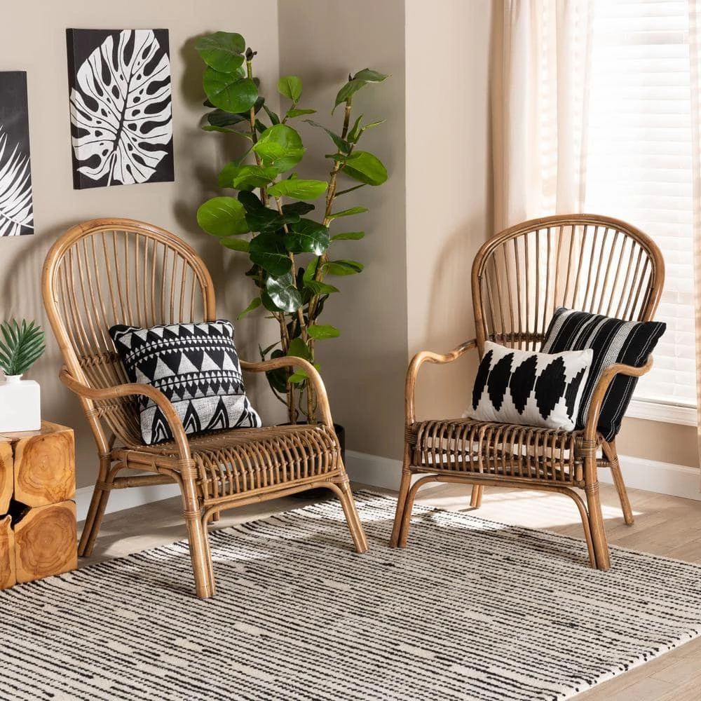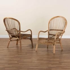 Relax and take it easy in tropical harmony with the wonderful Varali lounge chair. Handcrafted in Indonesia, this exquisite piece is entirely comprised of natural rattan. Slim rattan rods are laid within the frame and curved to form a soothing embrace, while convenient armrests encourage relaxation. The Varali will arrive fully assembled and utilizes angled legs connected by a crisscross base for excellent stability and support. Expressing the aura of an exotic haven, the Varali lounge chair elevates any interior arrangement.Due to the nature of the natural materials used in this product, it may have variations in areas such as, but not limited to, color, pattern, grain and texture. The hair-like strands of rattan/rattan-fiber are common due to nature of the material.