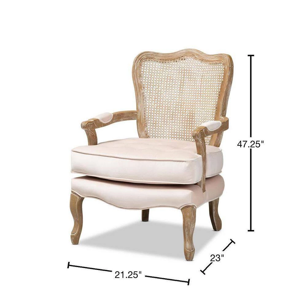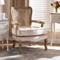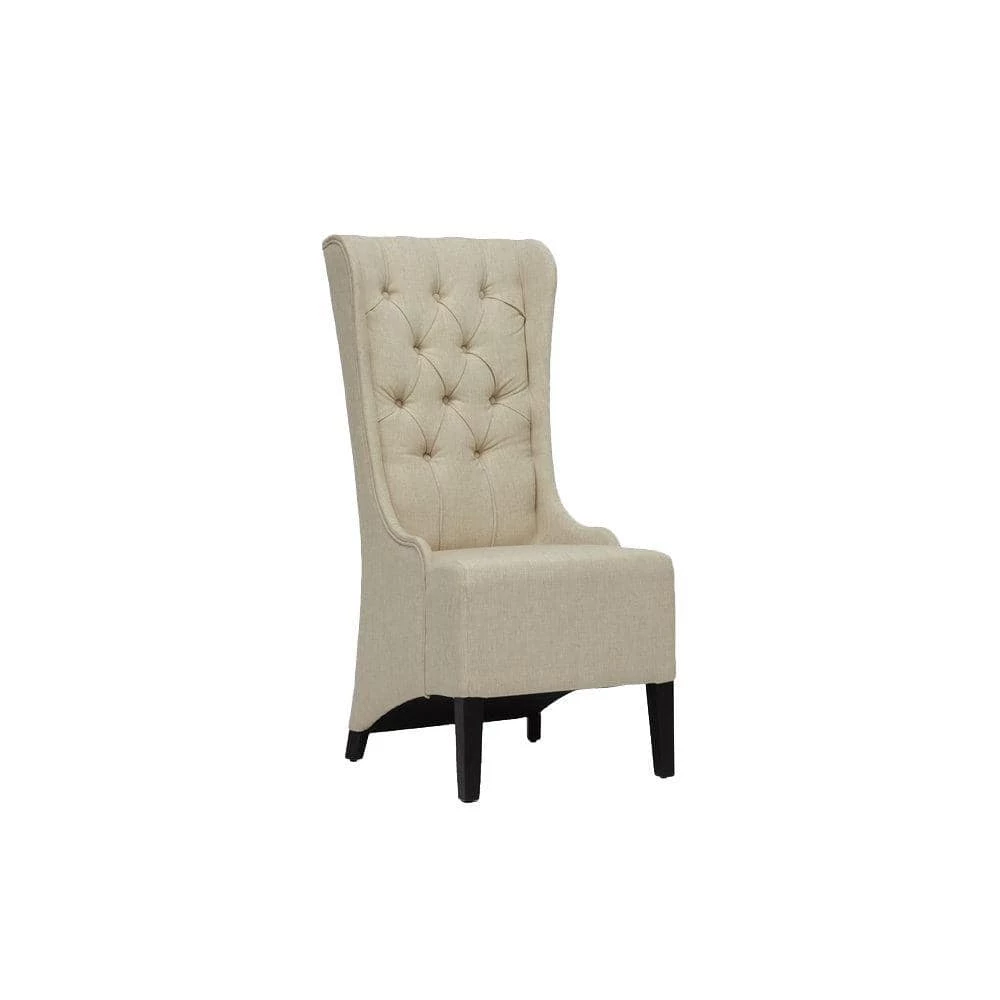 Traditional button tufting and neutral beige linen upholstery paired with a unique extra tall backrest make this otherwise classic design a modern force to be reckoned with. The resulting style screams luxury and designer inspiration but without the unapproachable price tag. The modern accent chair, which befits a classy lounge or living room alike, is built on a birch wood frame with black legs and foam cushioning. The fully assembled Vincent Chair is made in China and should be spot cleaned. A matching loveseat is also available (sold separately).