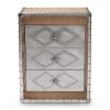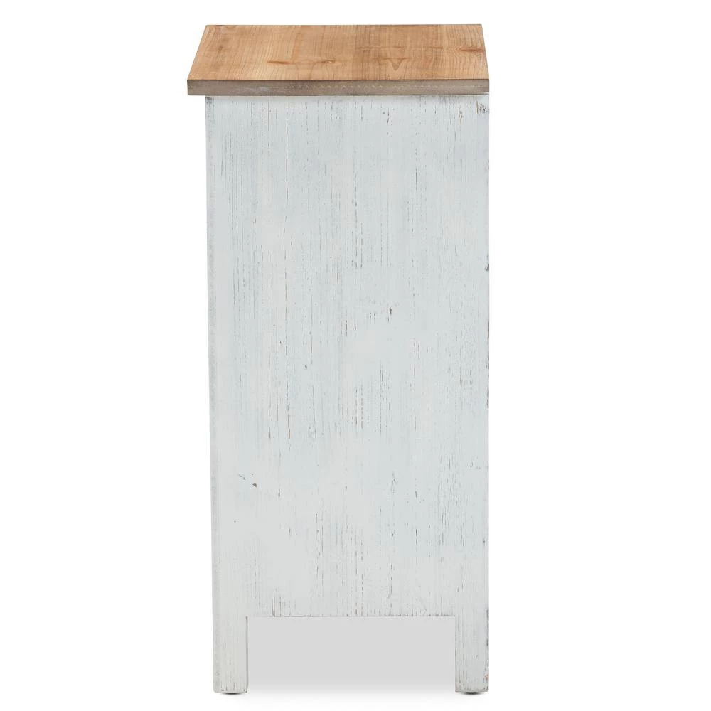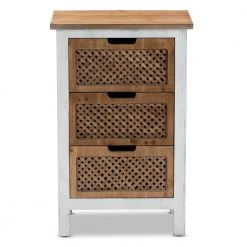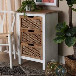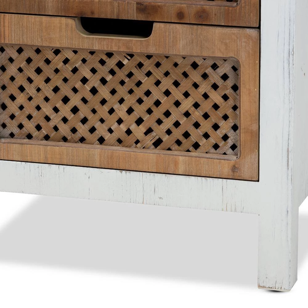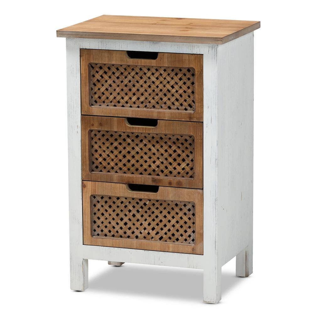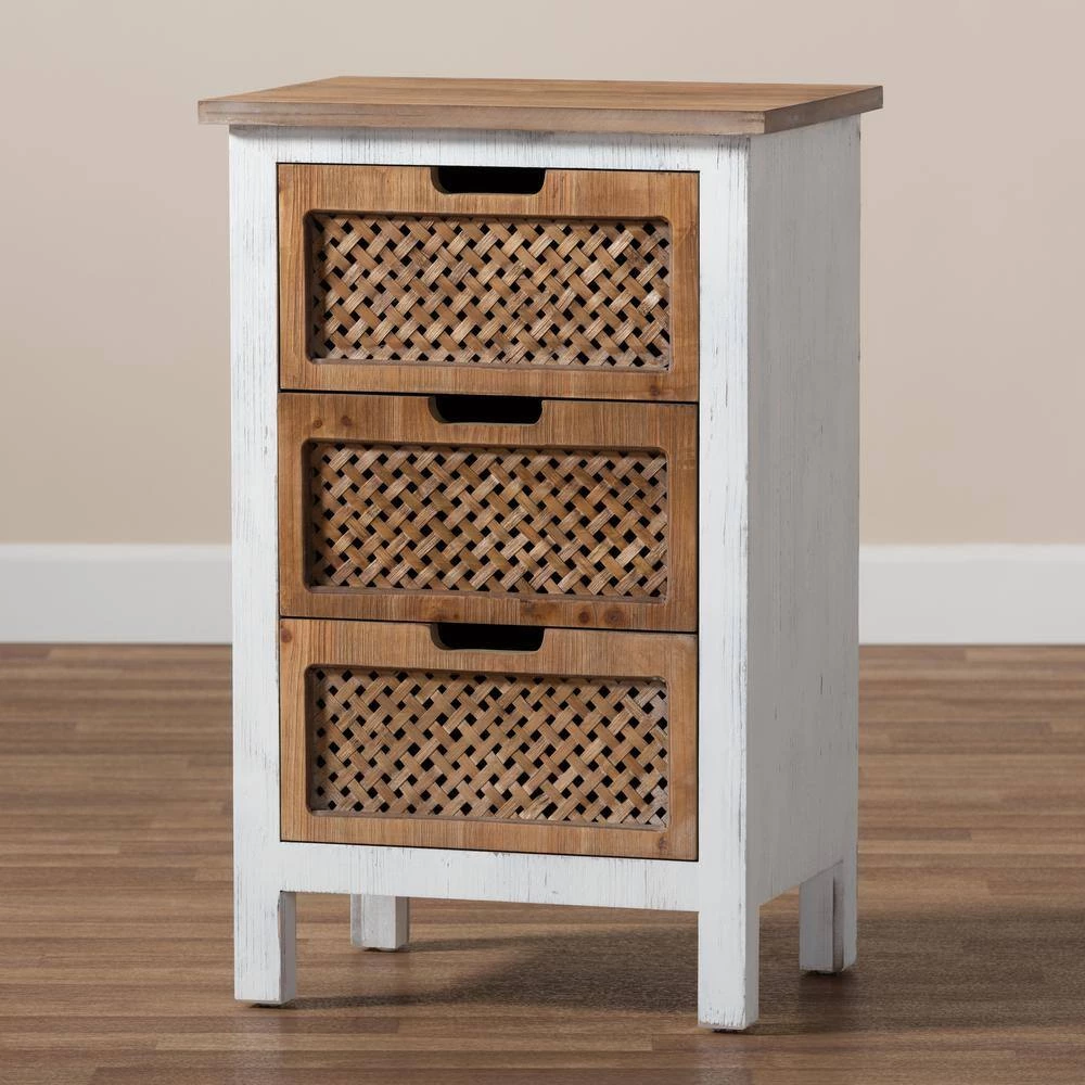 Bring order to busy rooms with the unique look of the Vincent cabinet. Made in Malaysia, the Vincent provides plentiful storage space in the form of three drawers, perfect for rooms with limited space. A striking oak finished wood top makes the cabinet a great pedestal for decorations. Fully assembled, the cabinet showcases a weathered white wood finish that complements the natural finish on the top and drawers. The woven design on the drawer faces lends a casual, retro look, while cut-out handles add a modern touch.