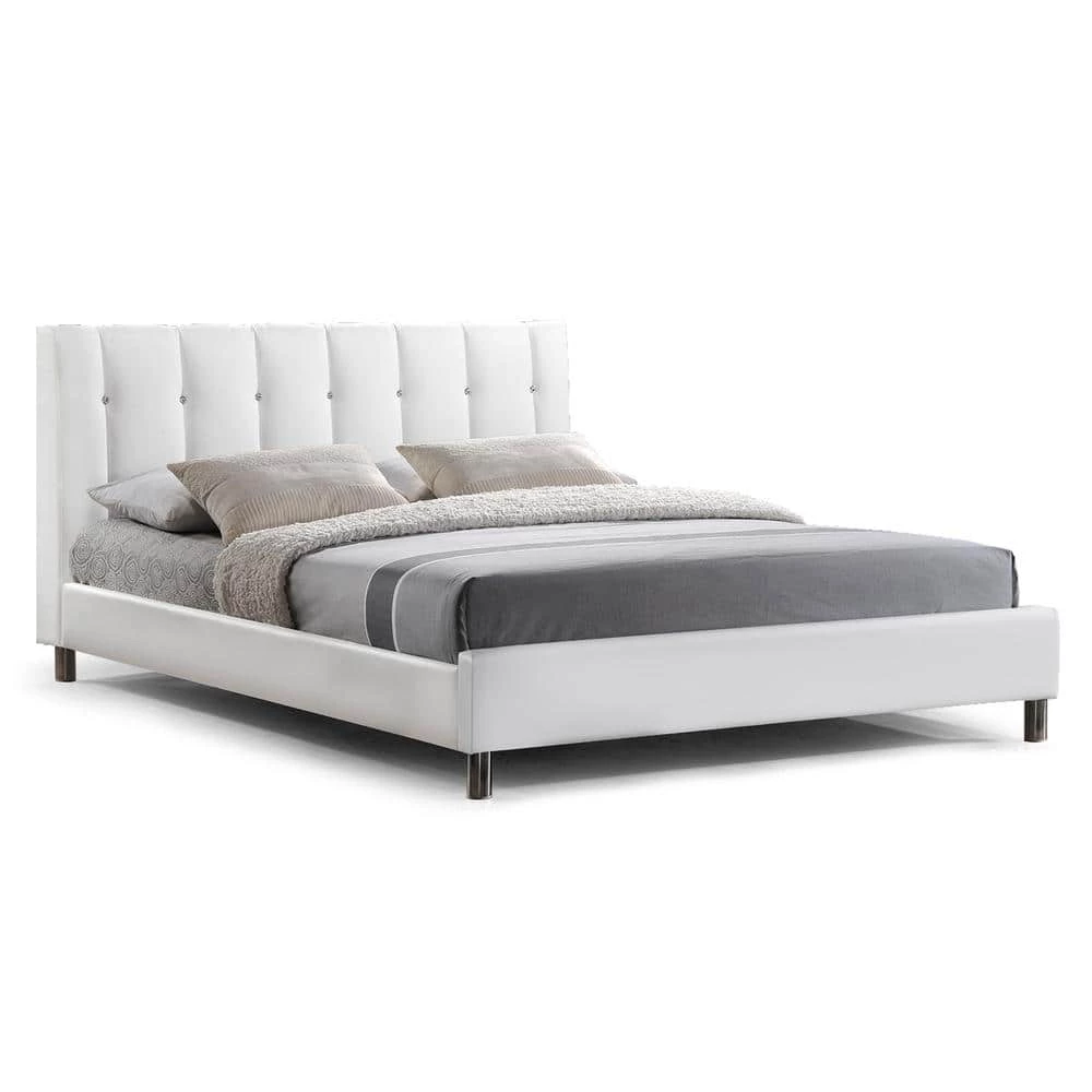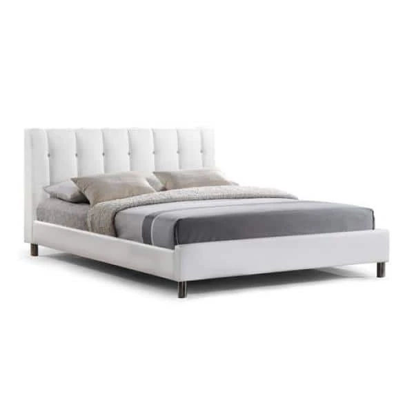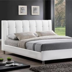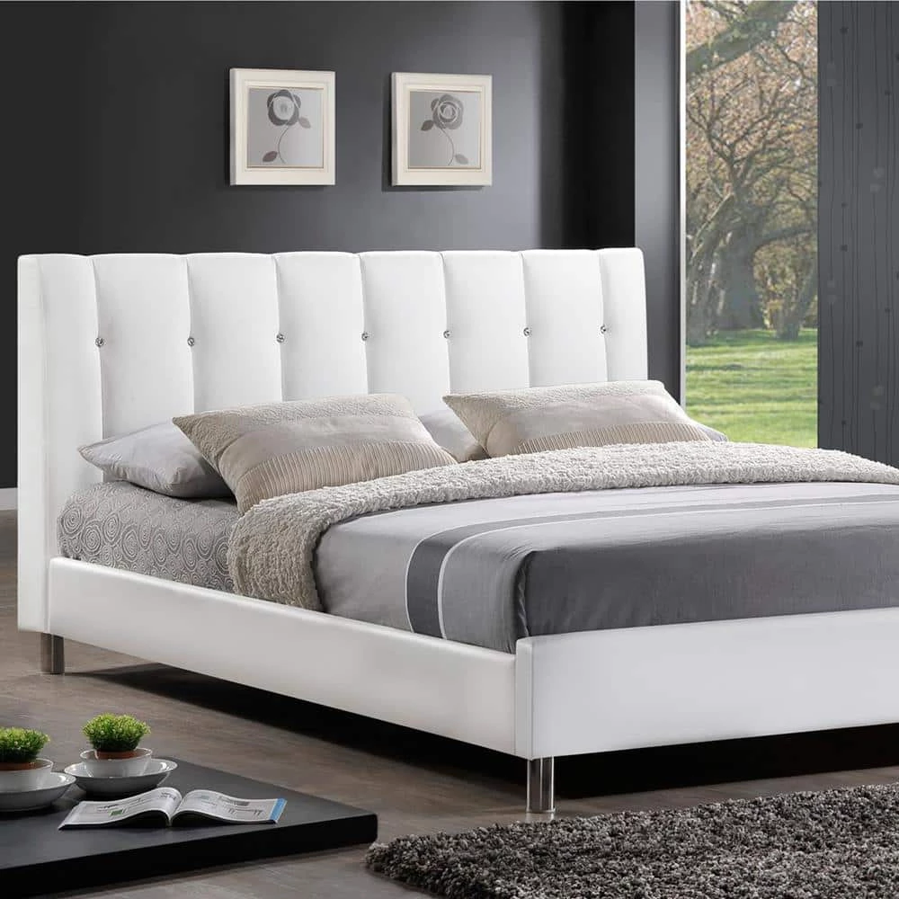 Grab some Zs and count some sheep: get a good night’s sleep in the sophisticated Vino Designer Bed. The queen-sized modern bed frame is constructed with solid rubberwood, padded with foam, and upholstered with black faux leather. Glittering faux crystal buttons dot the headboard for a touch of regality. Seeing that this is a platform bed and wooden slats are included with purchase, only a mattress is required. To clean, wipe with a damp cloth. This Malaysian-made contemporary bedroom furniture piece requires assembly and is available in both black and white in either full or queen size.