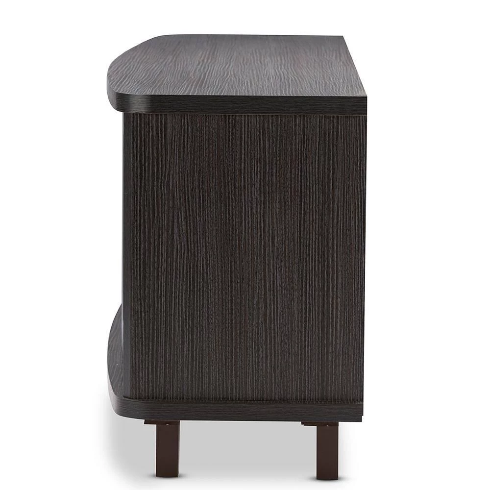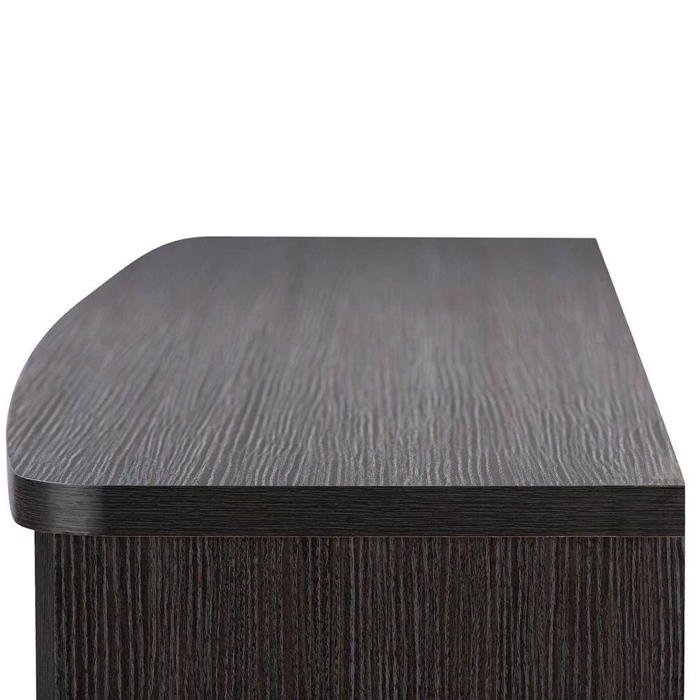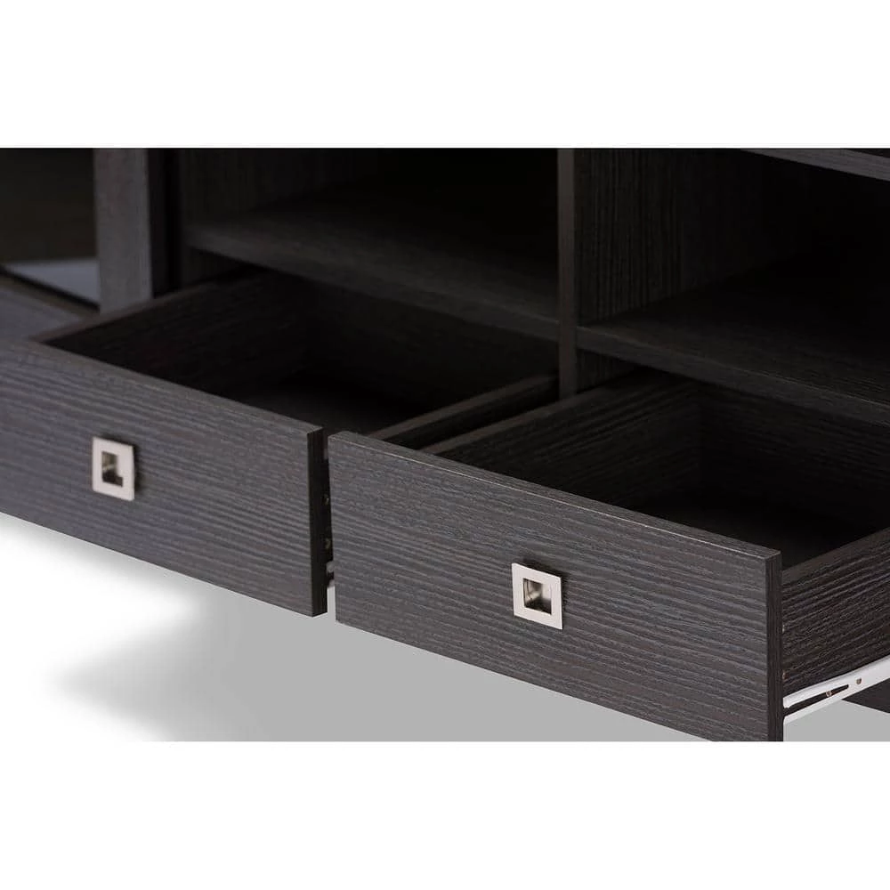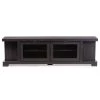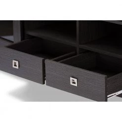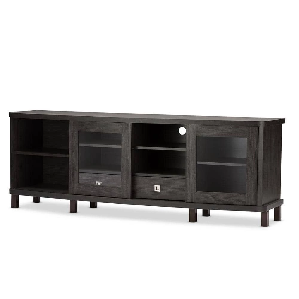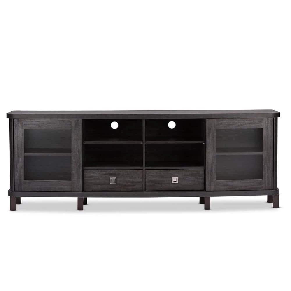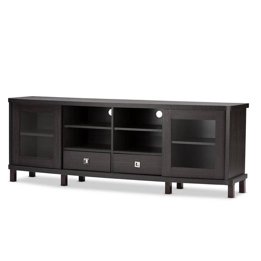 A romantic dark brown embossed finish covers the bowed case of this television stand. Constructed with your needs in mind, the Walda 70 in. TV cabinet features ample storage to keep your living room organized and free of mess. Two glass panel doors open to media shelves for easy storage and use of media players, gaming consoles, and more. Outer shelves are great for books, DVDs, or decorative touches. Two drawers are perfect for hiding remotes, controllers, coasters, and cards. Coupling storage and sleek design, this unit is perfect for your functional modern home. The TV stand is made of engineered wood that is practical for everyday use. Made in Malaysia, it requires assembly with all of the hardware’s provided.