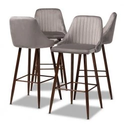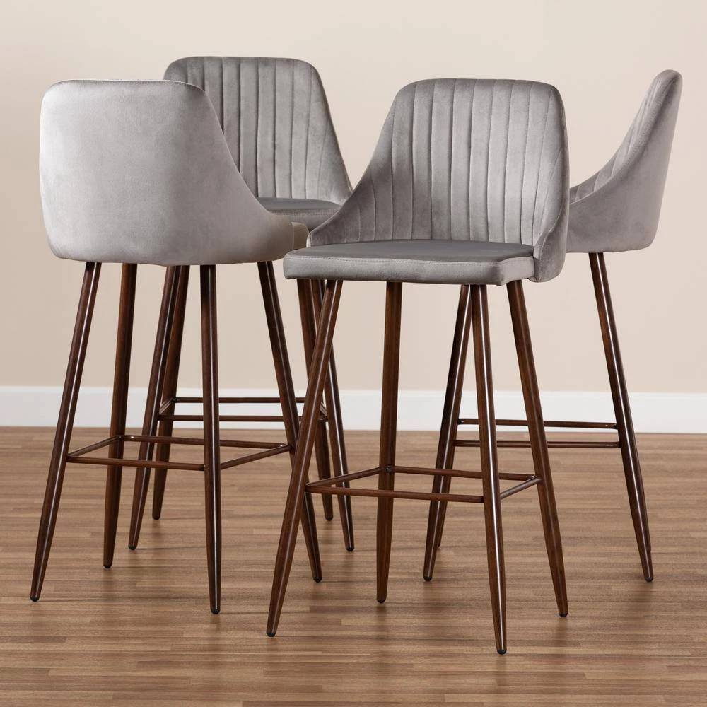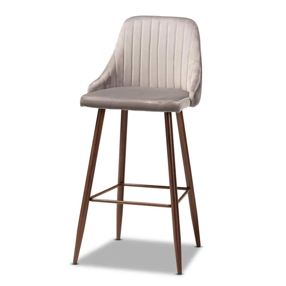 Easily add character to any home bar or lounge area with the unique Walter bar stool. Made in China, the Walter is composed of a metal frame overlaid with a chic walnut wood grain finish and fitted with a sleek velvet fabric upholstered seat. Stylish channel tufting adds a contemporary look, while foam padding ensures plush comfort. Requiring assembly, the Walter features ergonomic footrests on three sides. A visually stunning design equipped with excellent comfort makes the Walter bar stool an easy upgrade for any dining space.