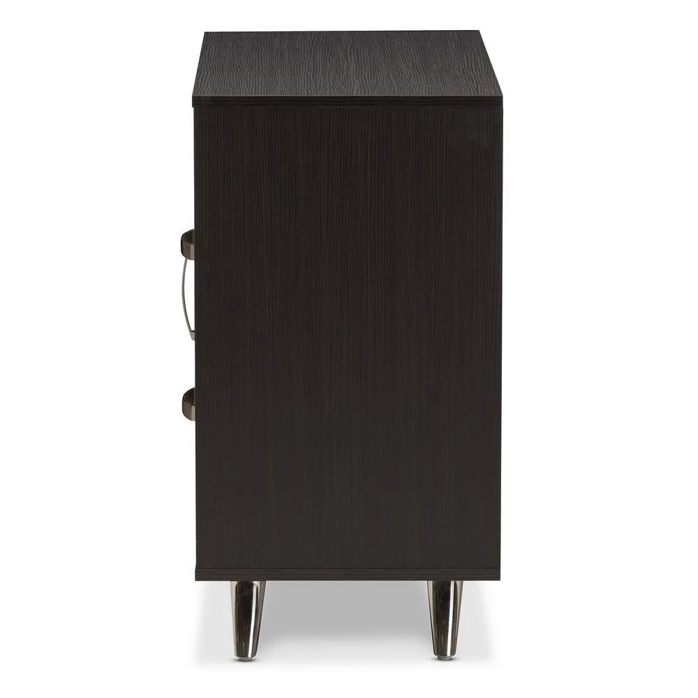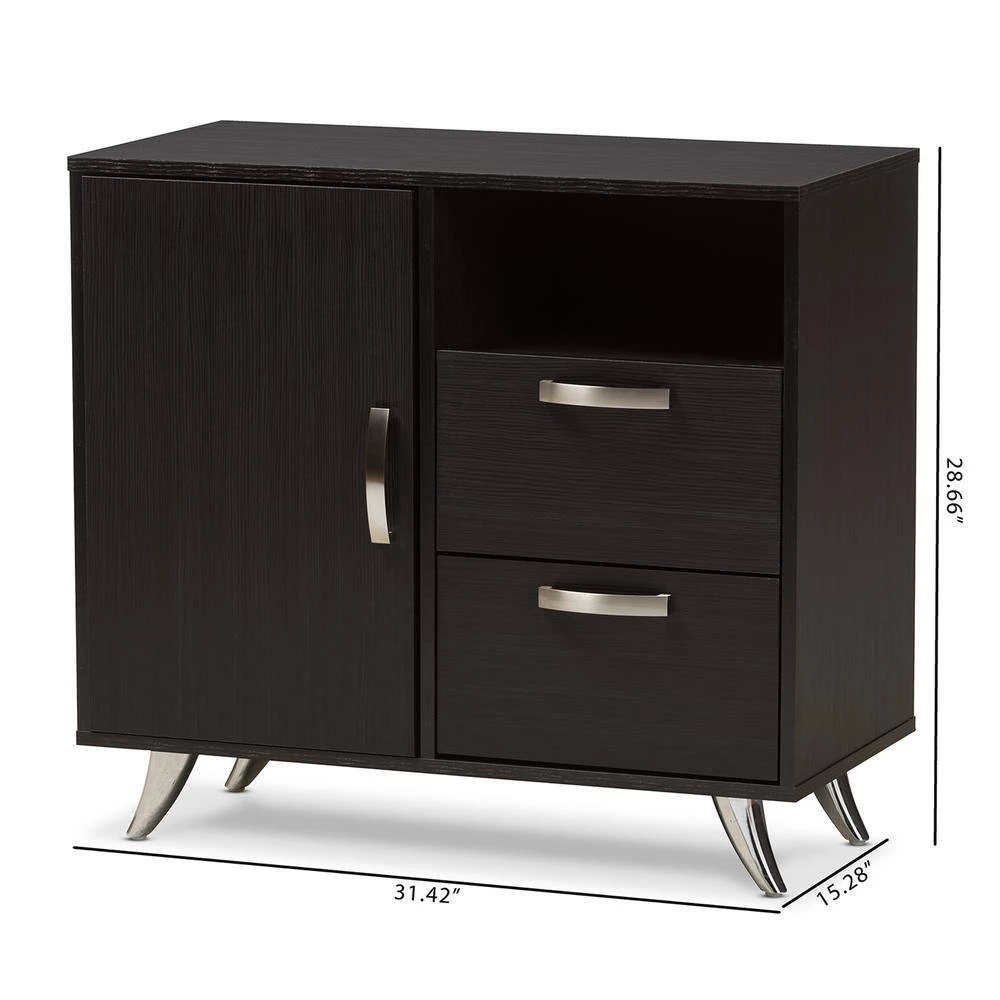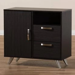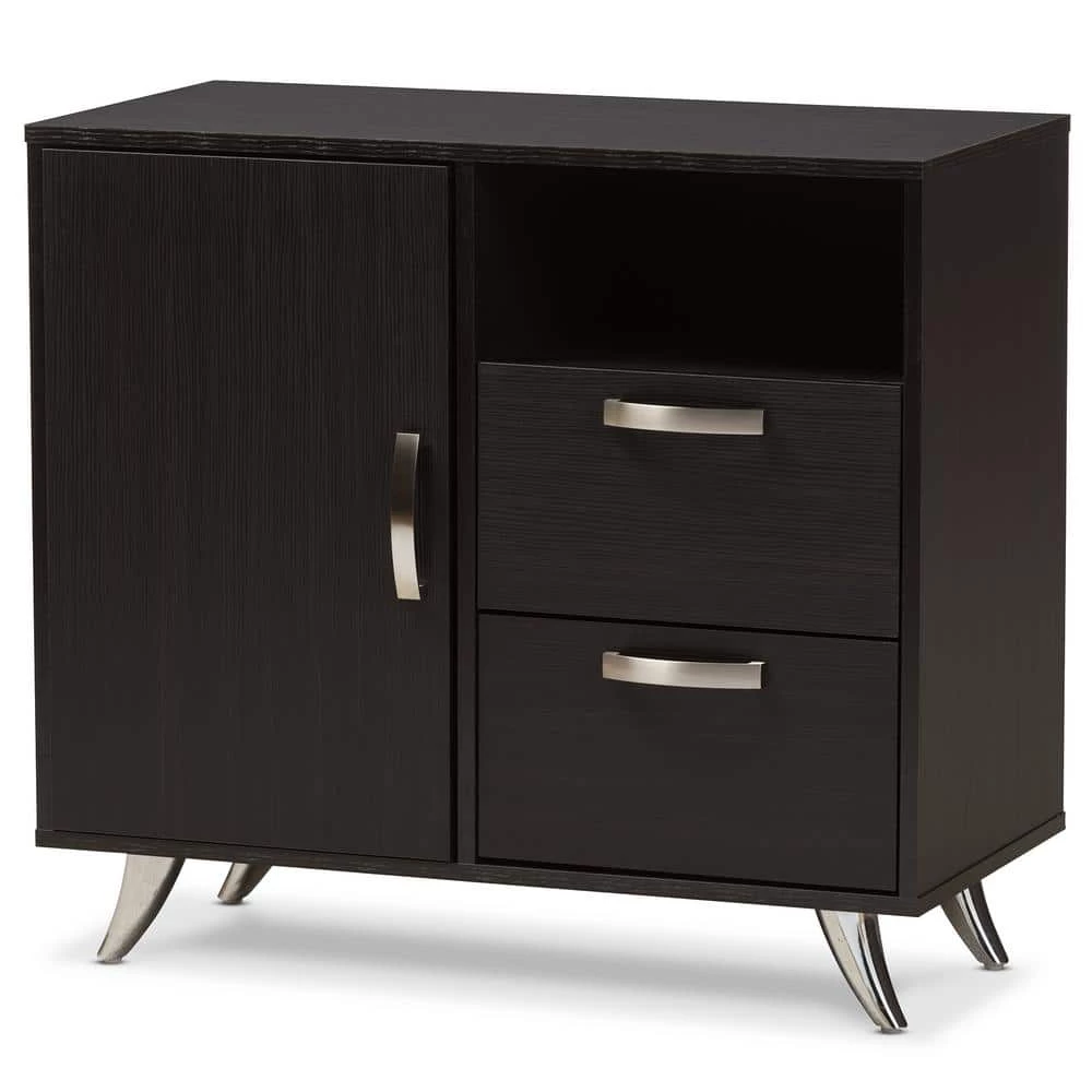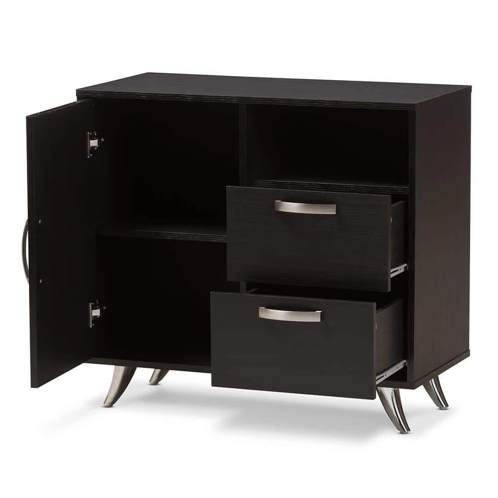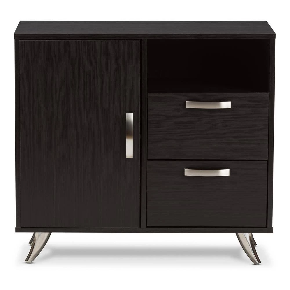 Opt for a minimalist look in your living room with the Warwick sideboard. Dark expresso brown finish instils luxe style in your masculine or modern interior. Constructed of engineered wood and MDF boards for sturdiness, the sideboard features 2-compartments with door, an open shelf and 2-pull-out drawers on pre-installed drawer slide for handy storage to stash knick-knacks in your living or dining area for practicality. Silver-finished metal legs and handles complement your contemporary decor. Made in Malaysia, the Warwick requires assembly.