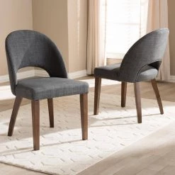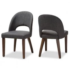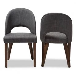 The Wesley dining chair is both fun and functional. The mid-century modern-inspired design of this chair evokes a retro charm. Constructed of solid, walnut-finished rubber wood, this dining chair is built to last. The Wesley is upholstered in dark grey fabric with a foam-padded seat. The chair back is delightfully bowed and open for comfort, with a smooth arched design. Add a fun and retro flair to your dining room, living room or any other shared space with the Wesley. Made in Malaysia, this chair requires assembly.