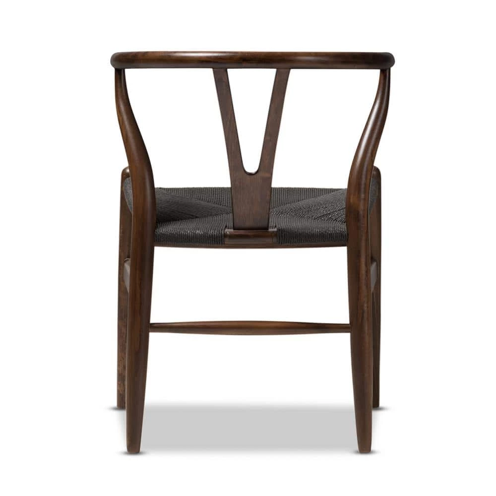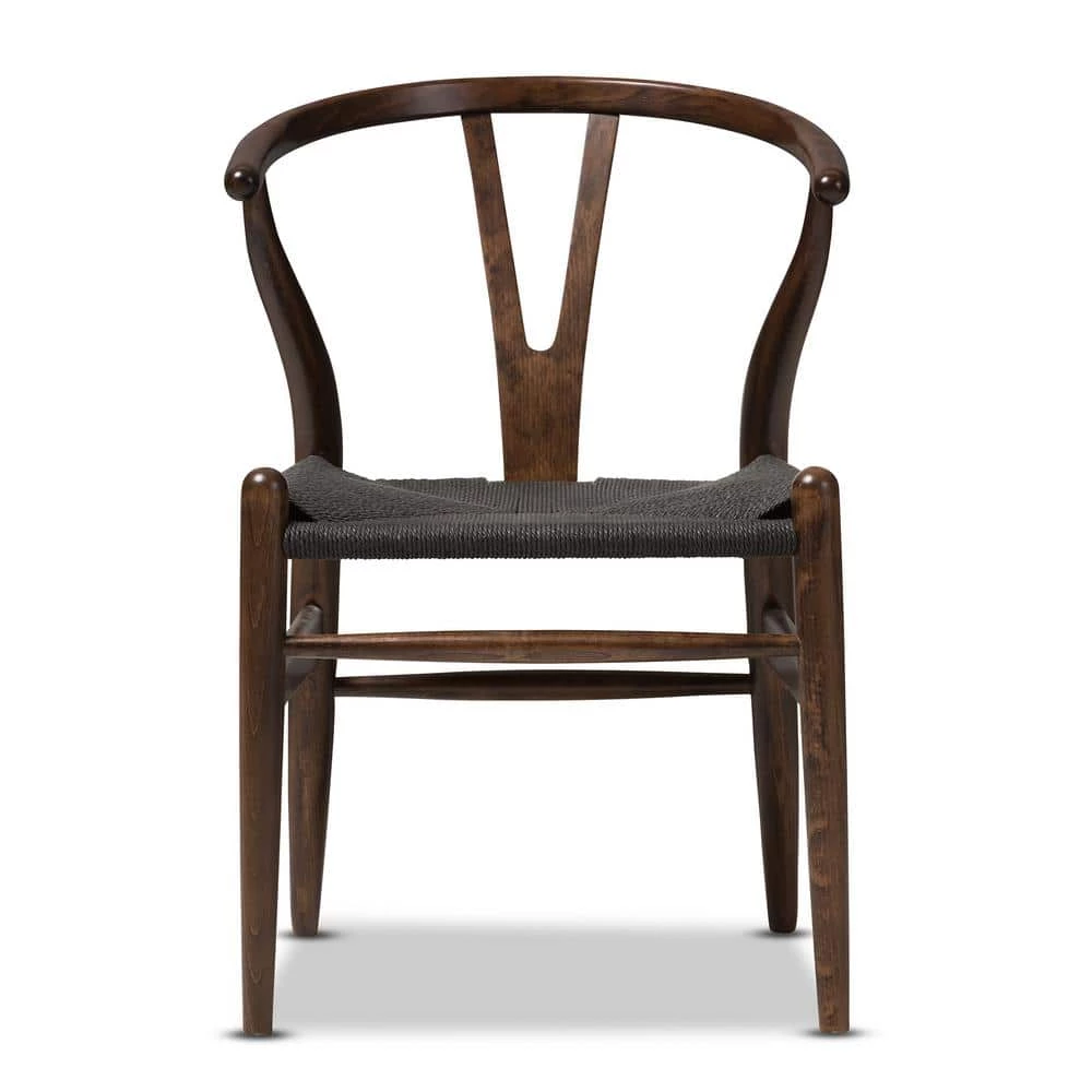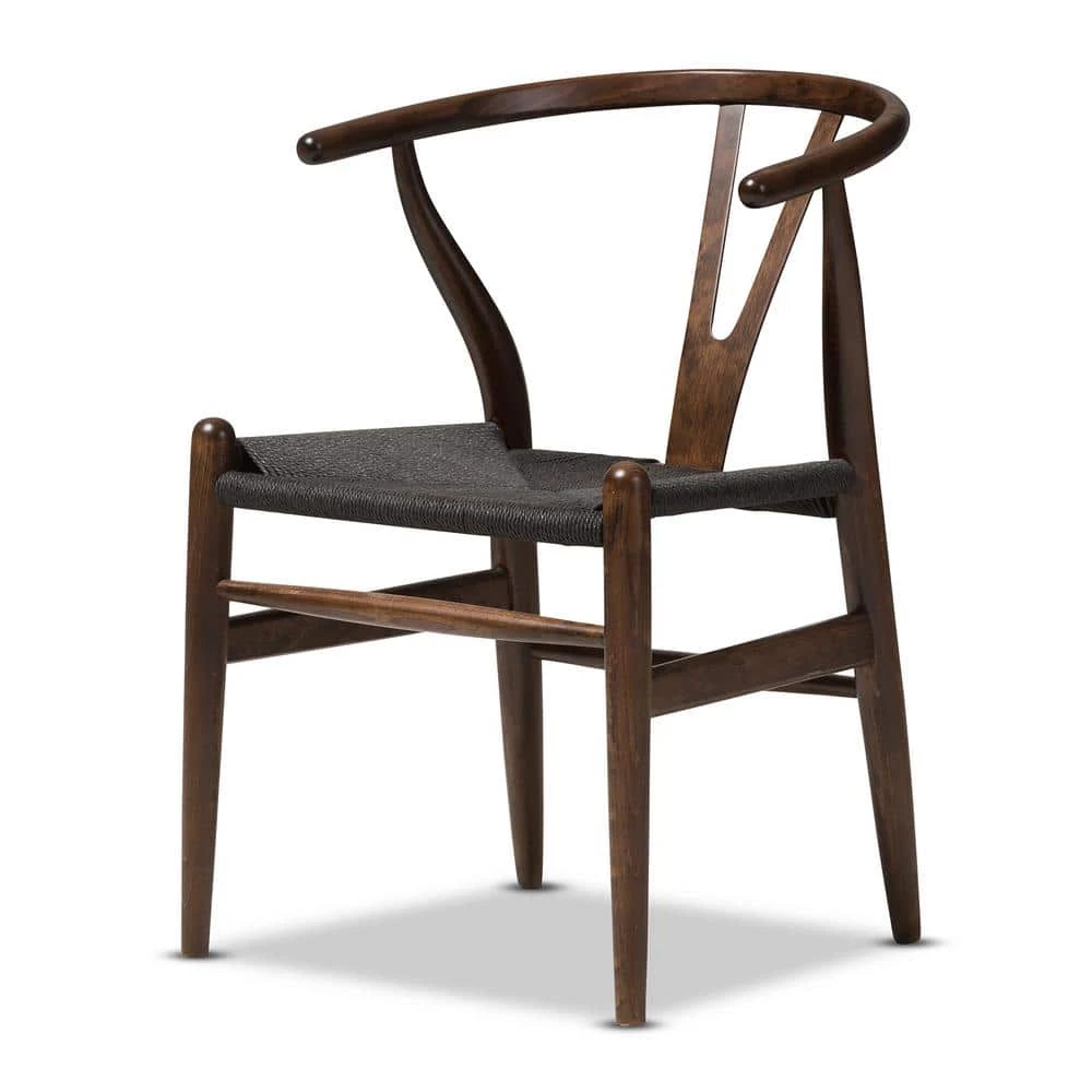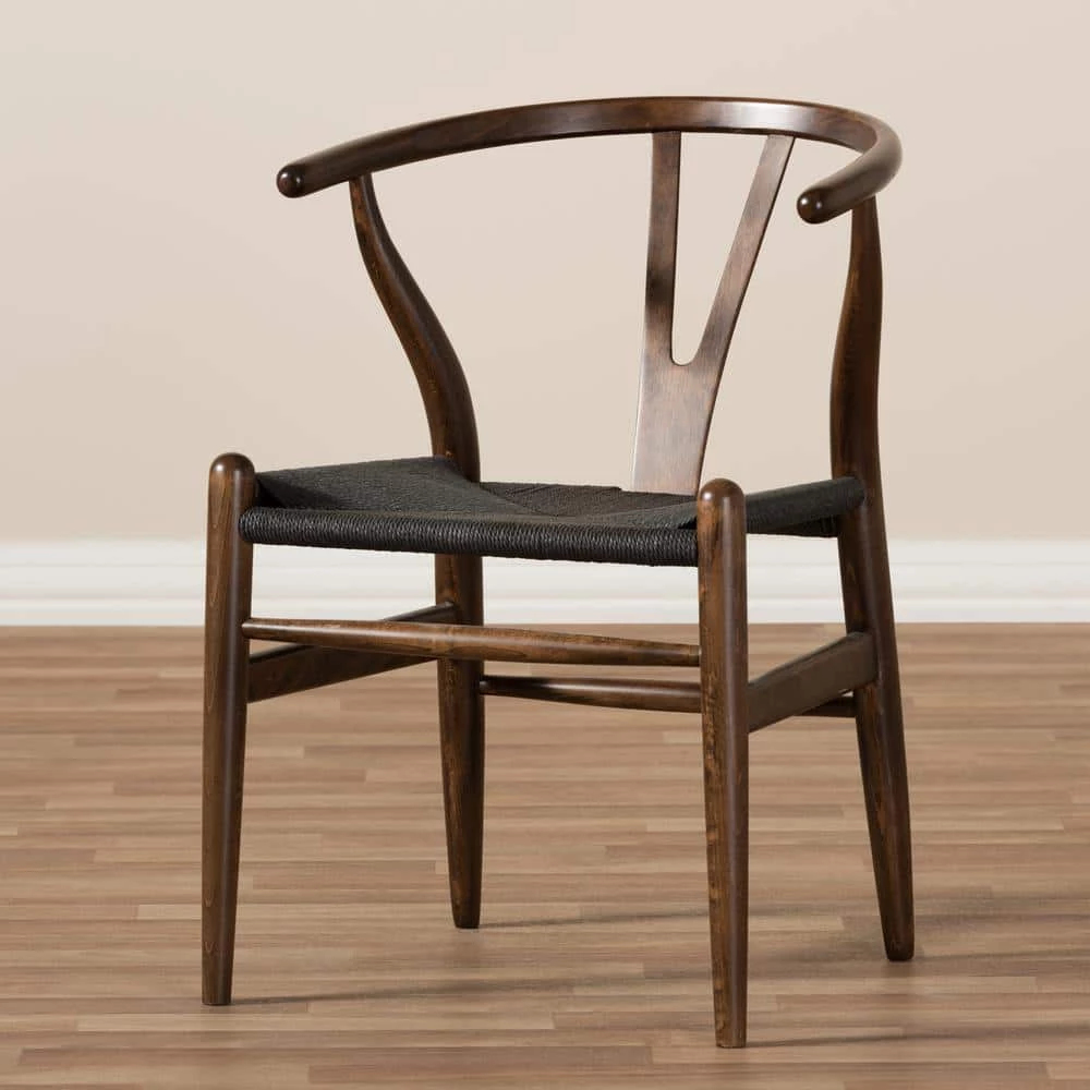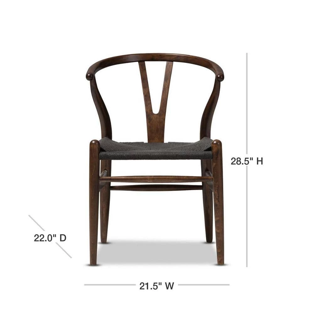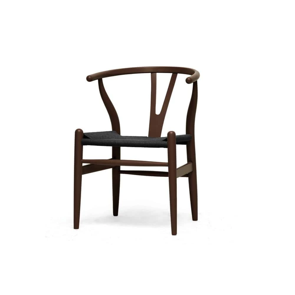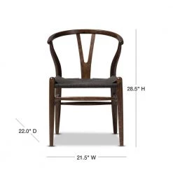 This mid-century dining chair features traditional wood and is paired with a modern form, resulting in a unique piece for your home. The frame consists of solid wood with a dark brown finish, a curved backrest and sturdy black hemp seat. This item will arrive fully assembled and is also available in a light wood finish, dark wood finish, black, white, pink or green, all with natural hemp seats. This is a quality reproduction of the Hans Wegner Wishbone Chair, which is also known as the Wegner Y Chair, Carl Hansen Wishbone Chair, CH24 Wishbone Chair and the Wegner CH24. Dimensions: 20.75 in. wide x 21.25 in. deep x 26.125 in. high Seat height: 17.5 in.
