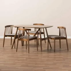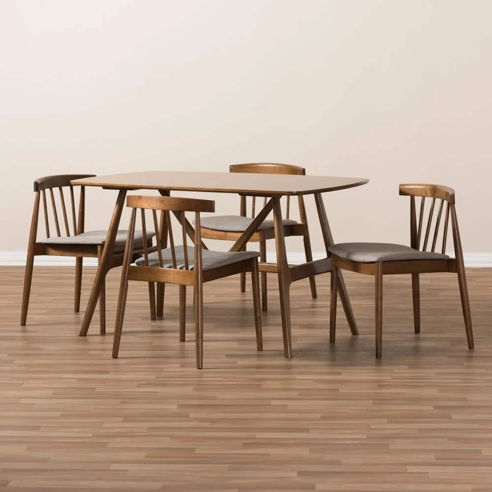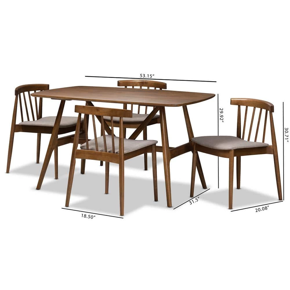The Wyatt 5-piece Dining Set is a timeless design reminiscent of the traditional English dining room. Crafted from solid rubber-wood frame to ensure perfect construction for years to come, this dining set comes with grey polyester fabric seat, which will lighten up any living space. Long, dainty legs combined with a classy spindle back create clean lines and a classic shape that make this dinette at home in almost any decor. Minimalistic and beautiful, this dining set can fit comfortably into Scandinavian style homes whilst paying tribute to traditional style. Made in Malaysia, the Waytt dining set requires assembly.