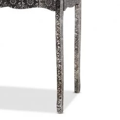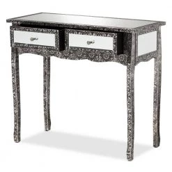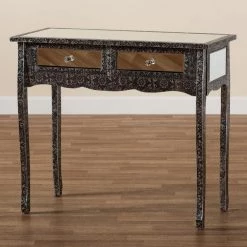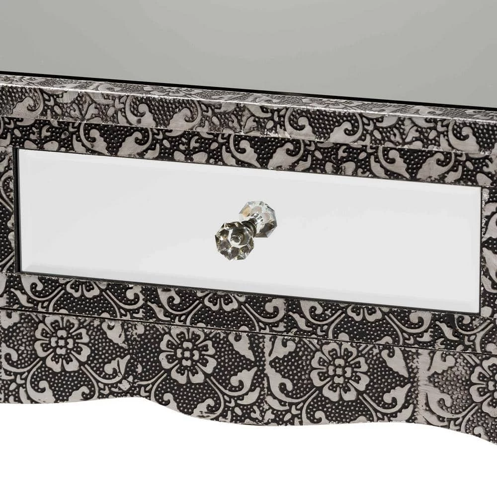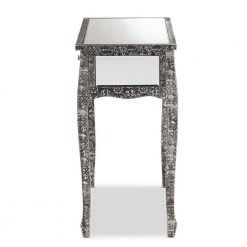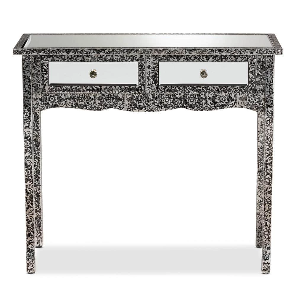 Introduce a bold statement of modern glamour to your space with the extraordinary Wycliff console table. Made in China, this stunning piece is comprised of a solid wood frame adorned with an embossed metal trim featuring a floral pattern. 2-drawers offer space to organize household essentials, while mirrored glass panels enrich the charisma of the piece. The Wycliff requires assembly and features cabriole legs for excellent stability and support in elegant style. Faux crystal drawer knobs lend a graceful touch, making the Wycliff console table a marvelous addition to any household layout.